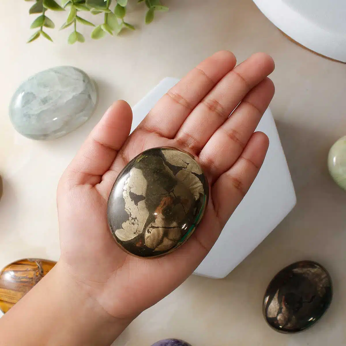 - Palm Stones are smooth polished stones that fit in the palm of your hand. When you are feeling a little anxious, stressed or worried you can rub them with your thumb or finger to help soothe yourself when you are feeling troubled. Holding a Palm stone creates a powerful connection between our being and the crystal’s energy. these oval shaped stones are excellent for meditation,relaxation and crystal healing.