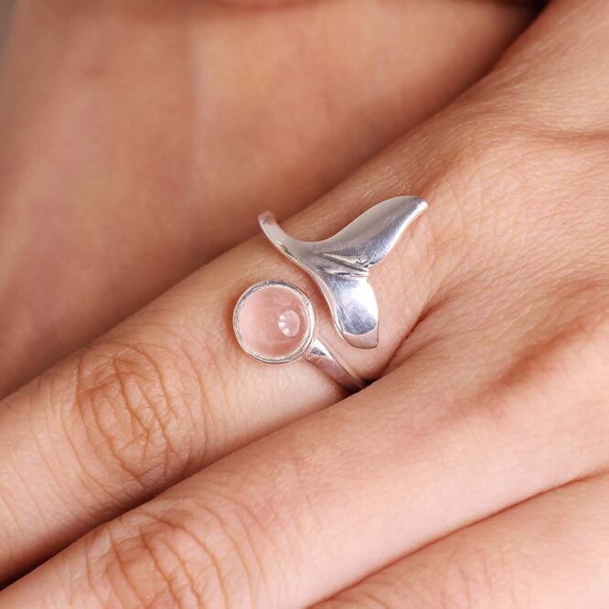 The Rose Quartz Dolphin Tail Ring in Silver is a charming blend of elegance and loving energy. Featuring natural rose quartz in a graceful dolphin tail design, this ring symbolizes love, compassion, and emotional healing.