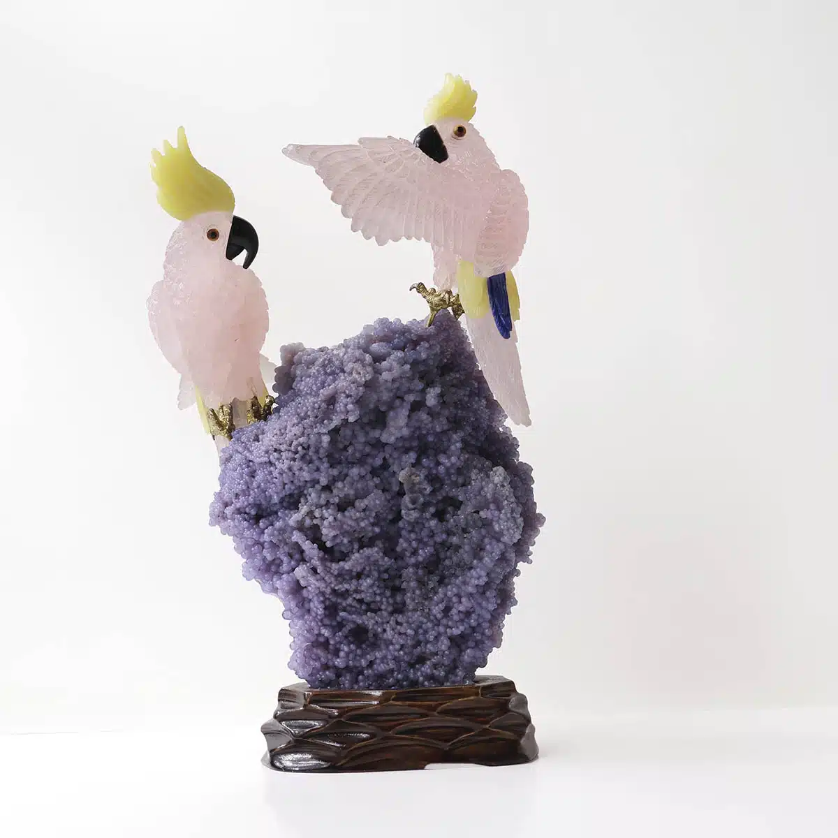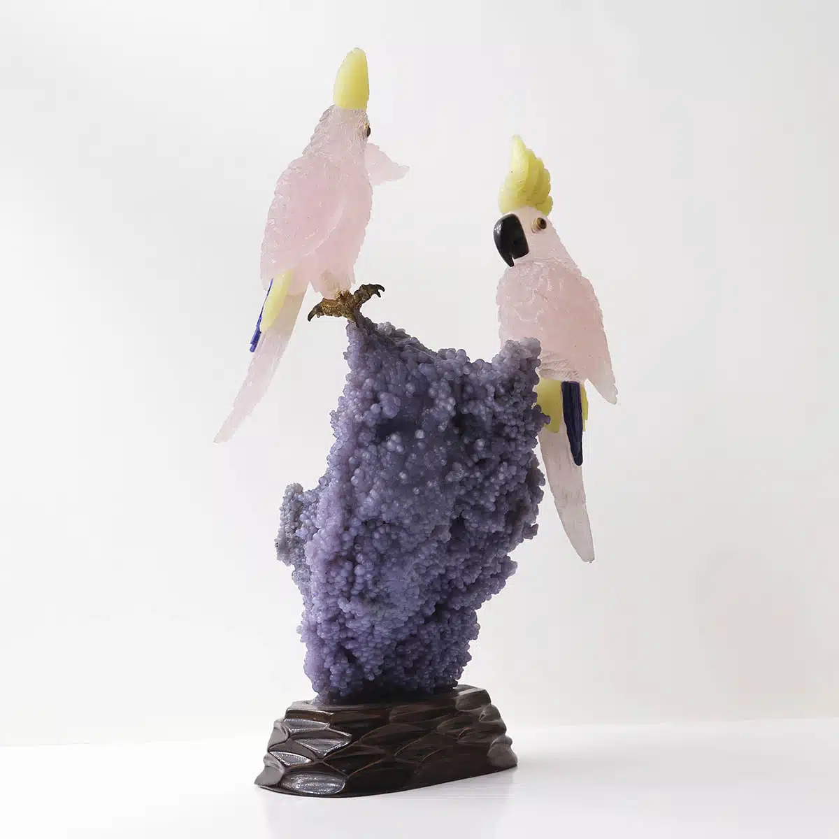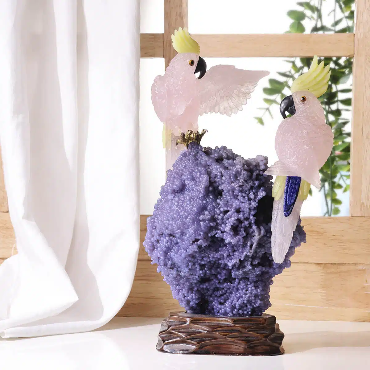 Benefits of Rose Quartz Parrots On Grape Agate :