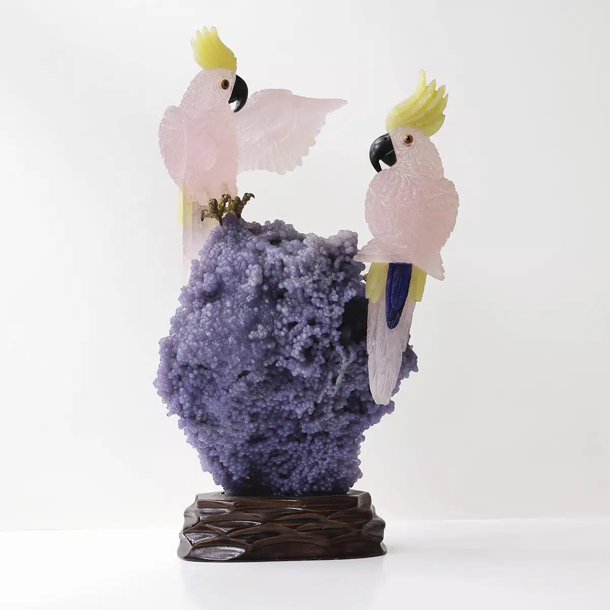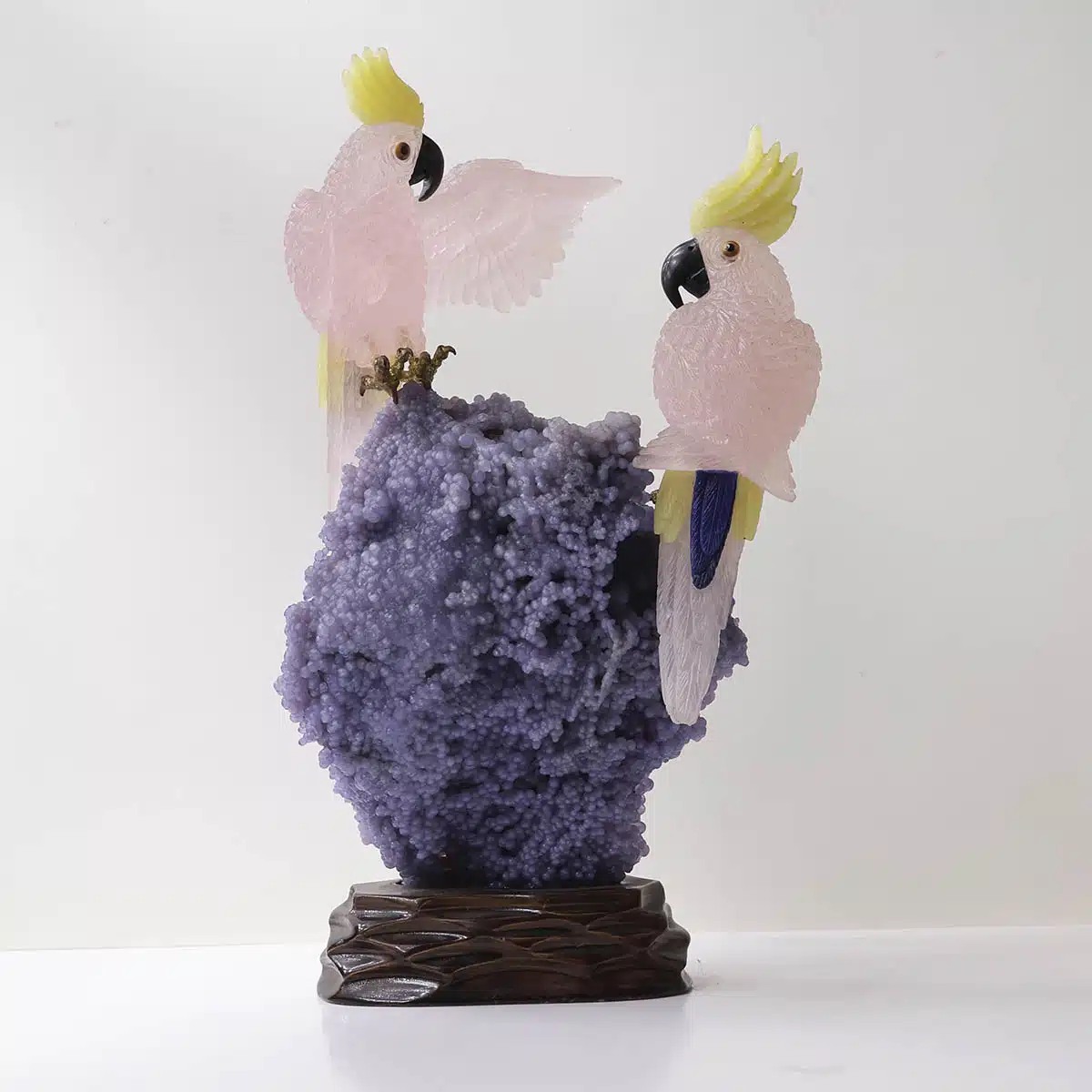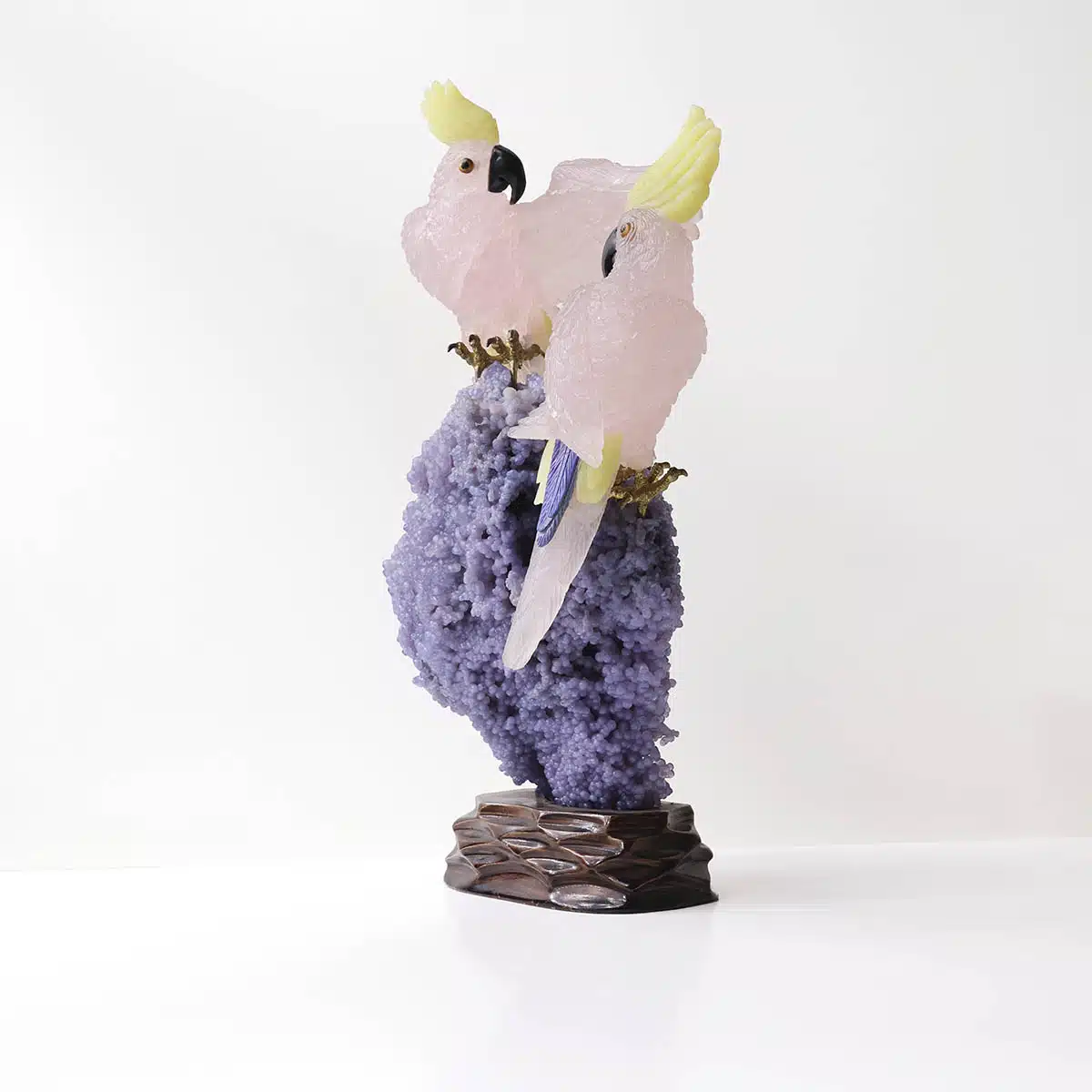 Benefits of Rose Quartz Parrots On Grape Agate :
