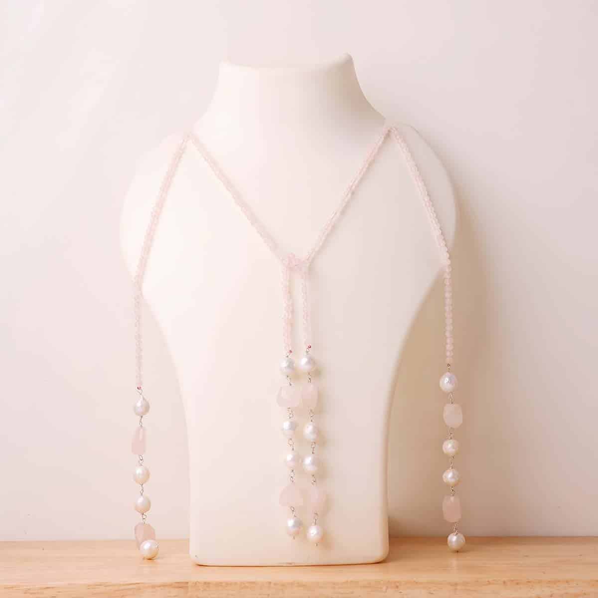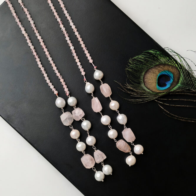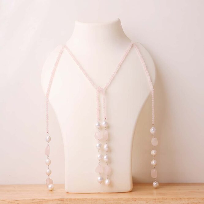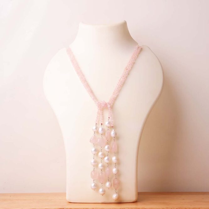 Benefits of Rose Quartz With Pearl Long Silver Knotted Necklace :