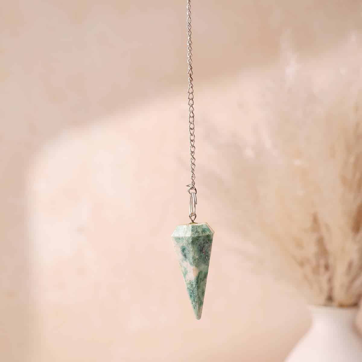 The Ruby Fuchsite Point Pendulum from Shubhanjali beautifully combines the heart-healing energy of Fuchsite with the passion and vitality of Ruby. This pendulum supports emotional balance, courage, and spiritual strength while aligning the heart and root chakras.