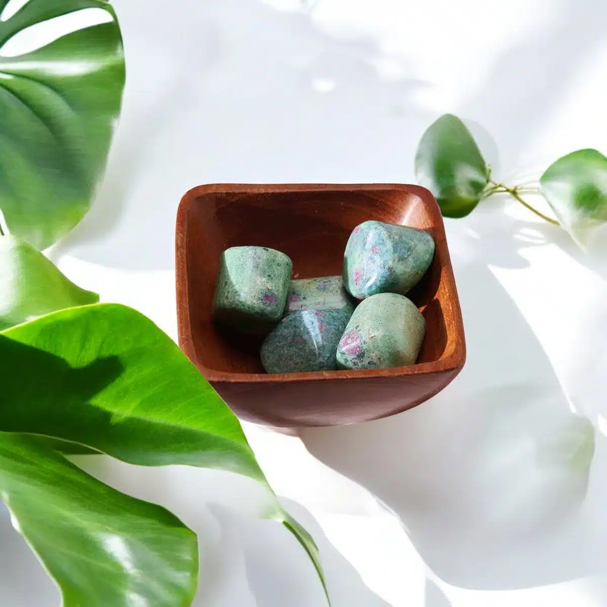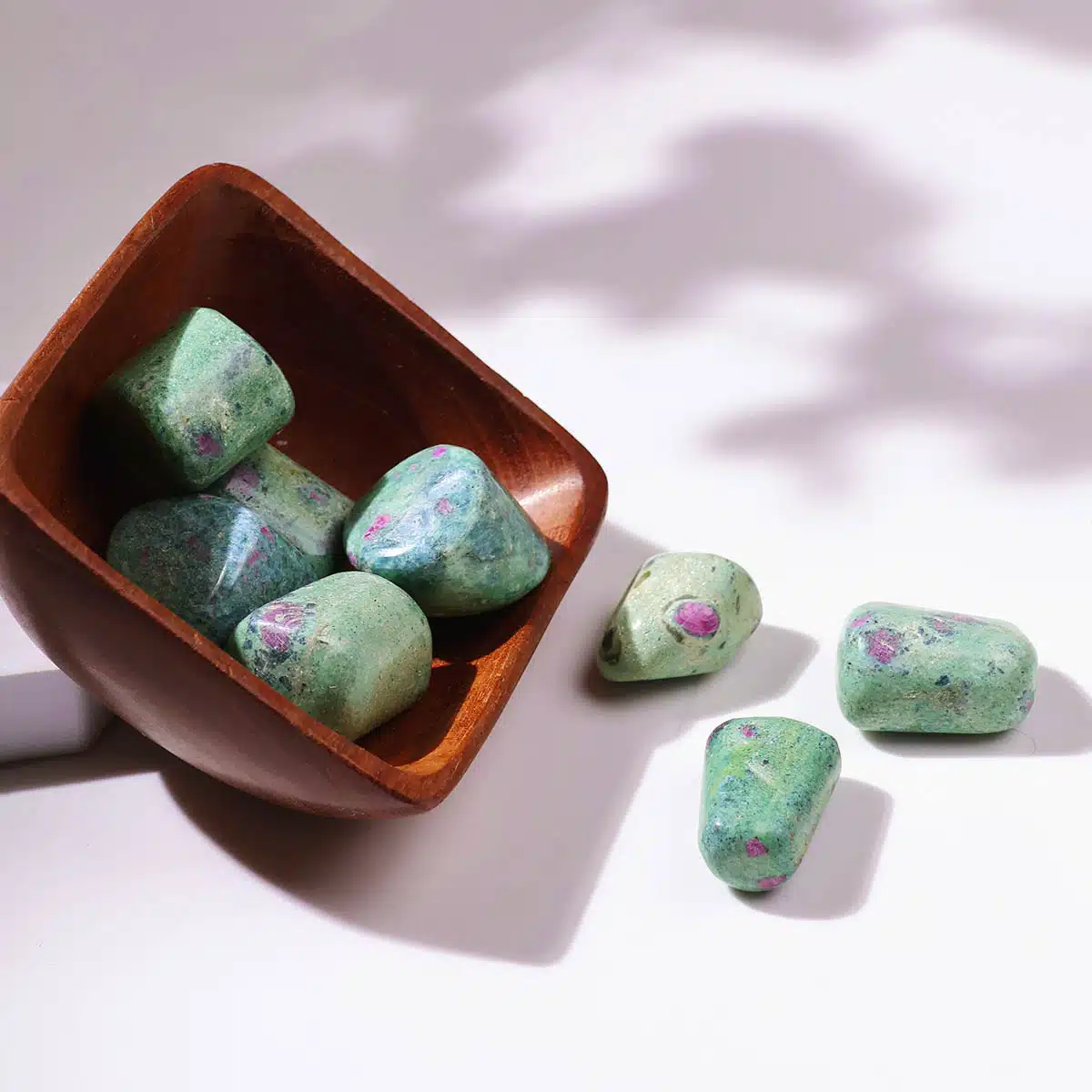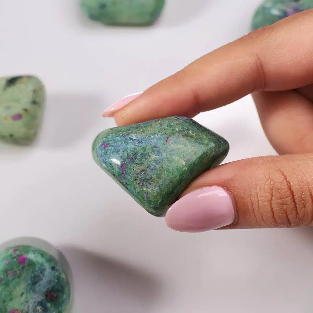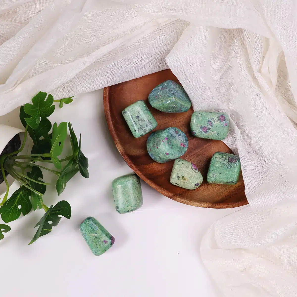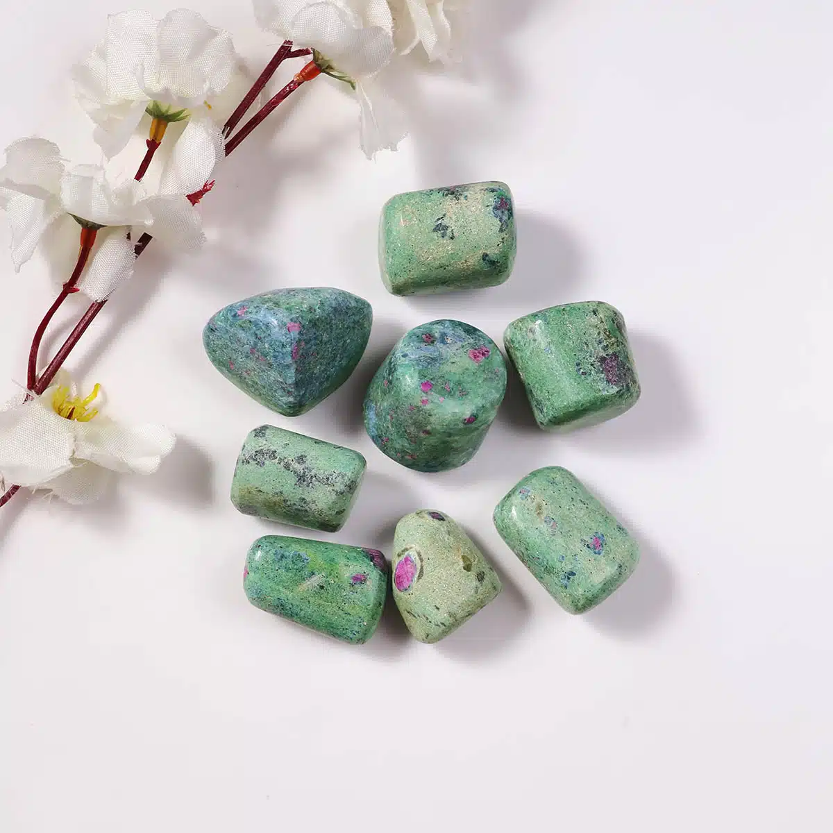 Tumble stones are a versatile shape that is all-purpose and radiates energy gently in various directions. Ruby Fustcite is also known as Anyolite. The stone s name comes from the Masai word which means green.