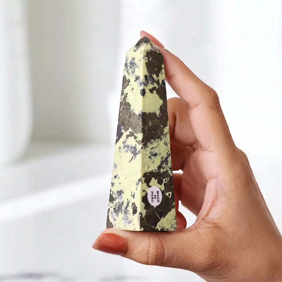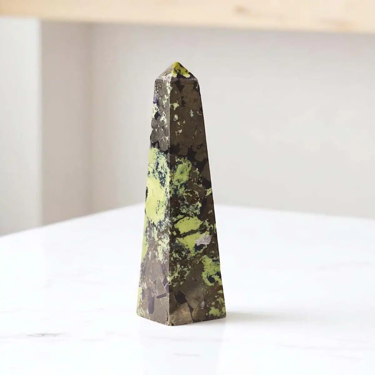 Serpentine with Pyrite Tower is a carved crystal point that blends the nurturing energy of serpentine with the bold, protective energy of pyrite. The tower shape is believed to amplify and direct energy upward, making it ideal for focused healing or spiritual work. This combination unites grounding, emotional balance, and energetic protection in one powerful form.