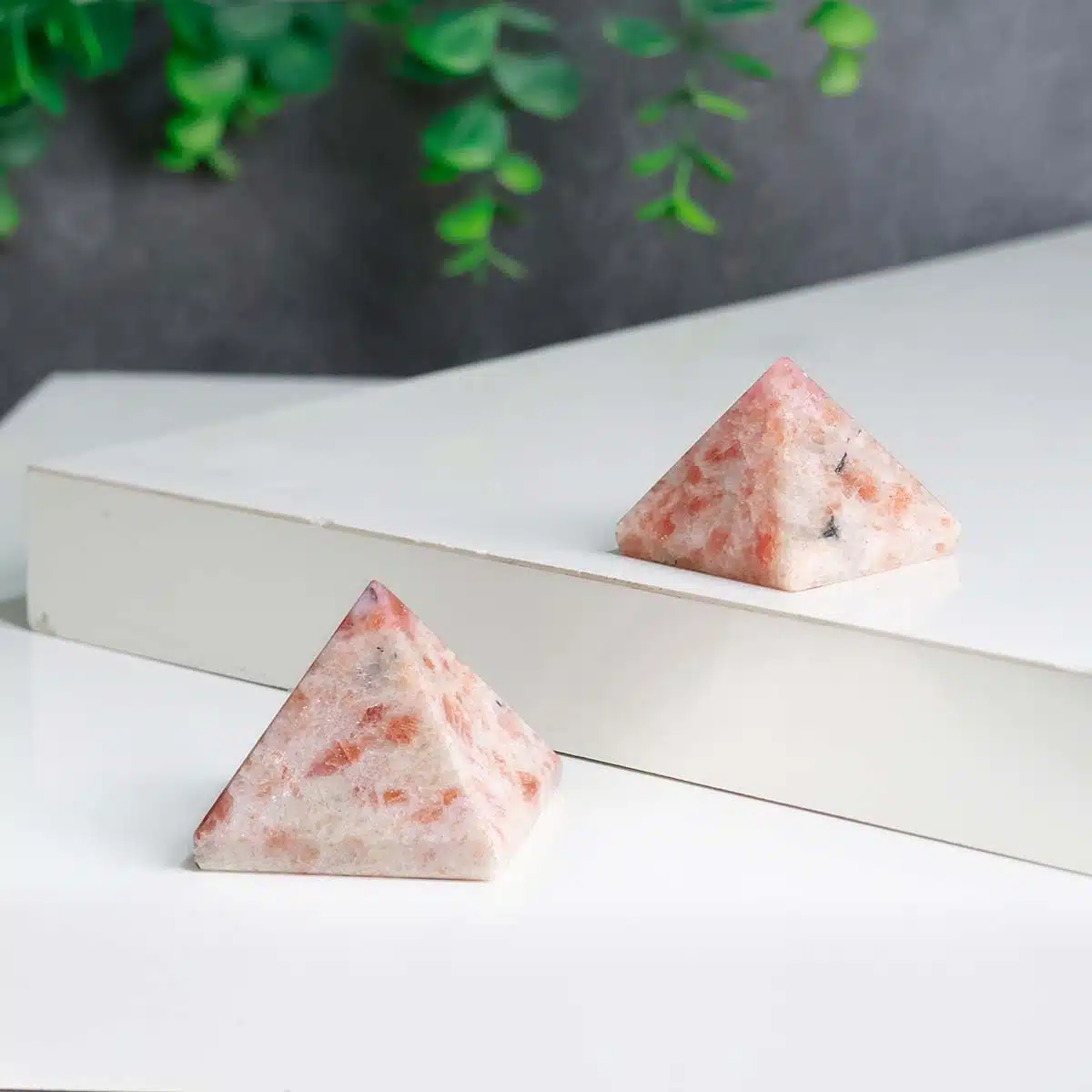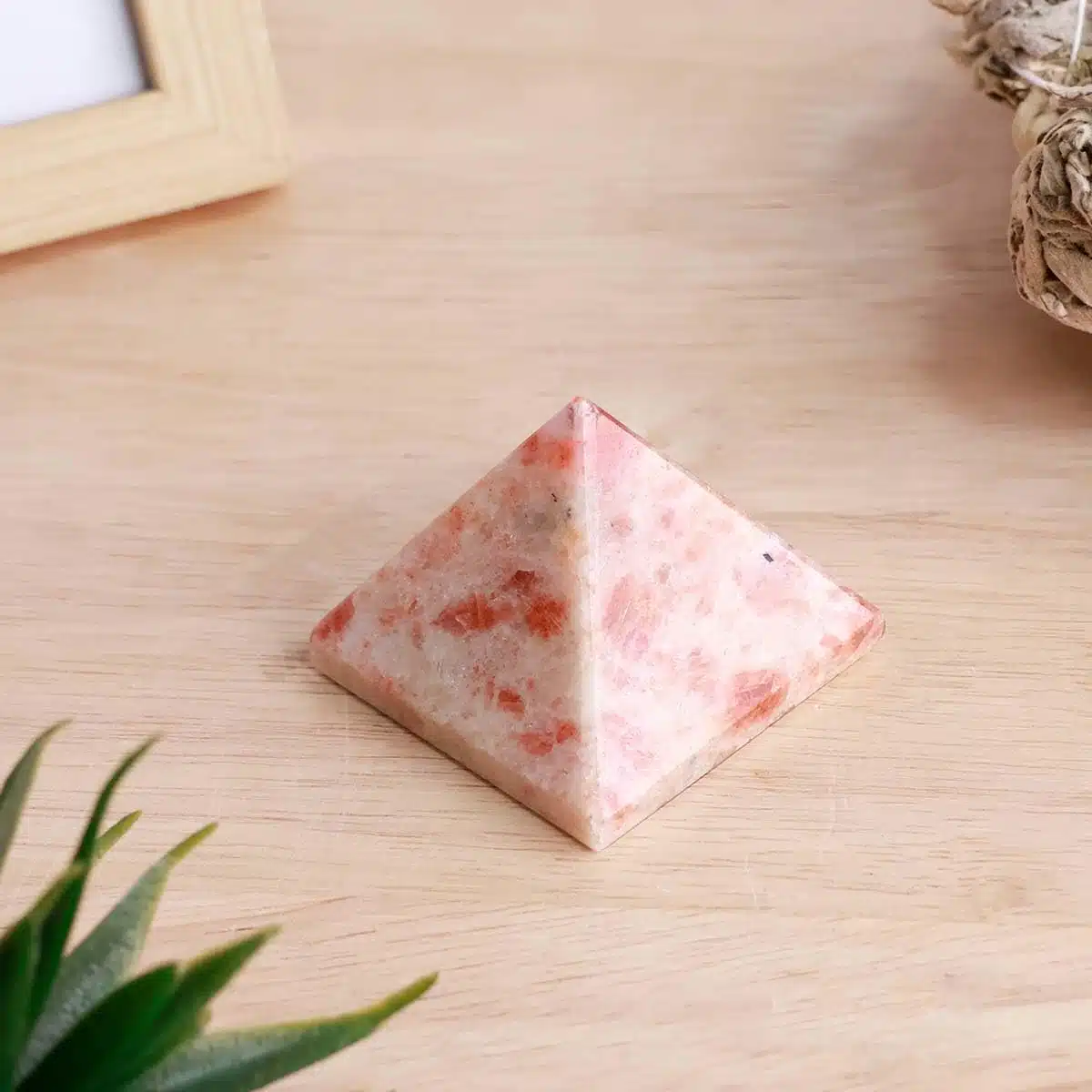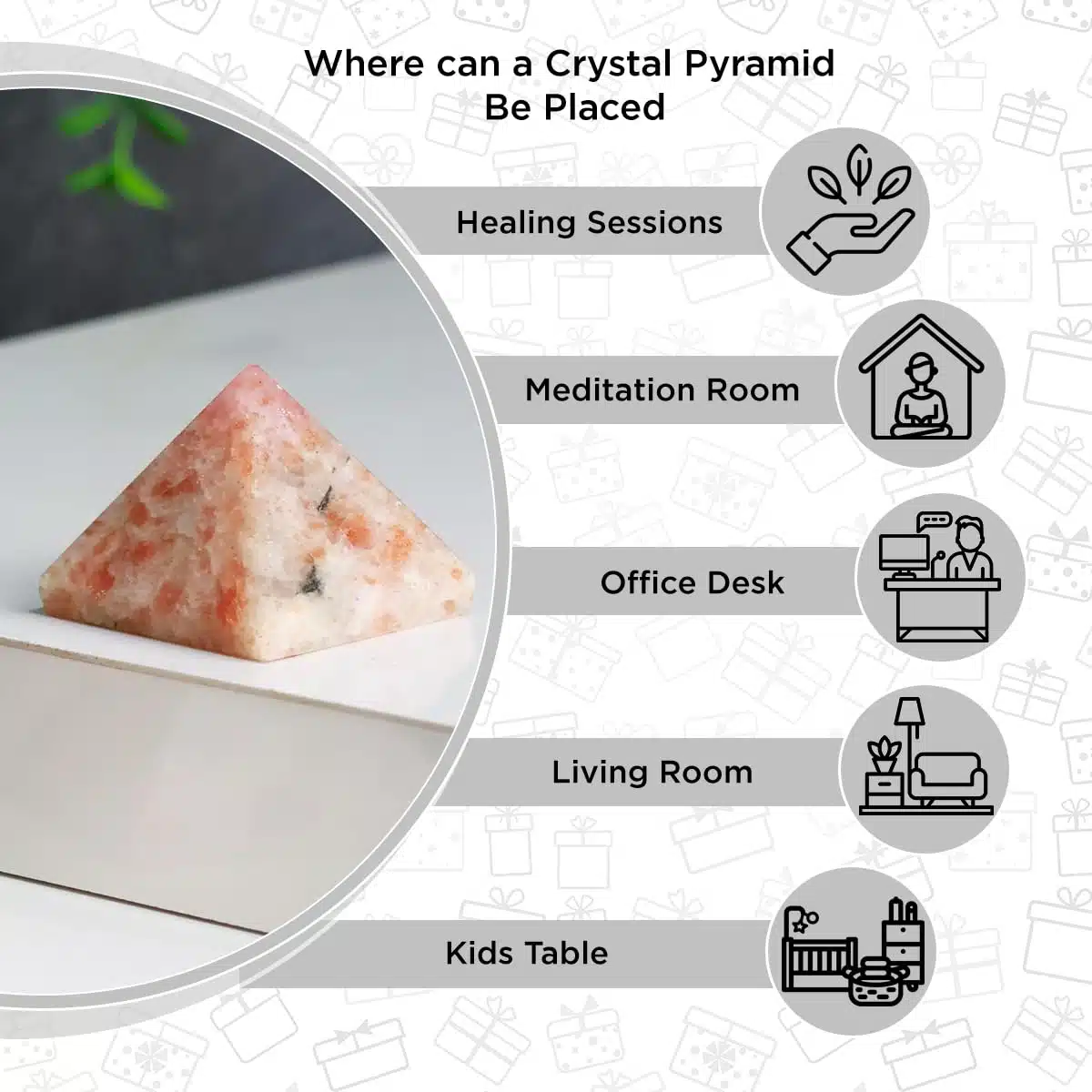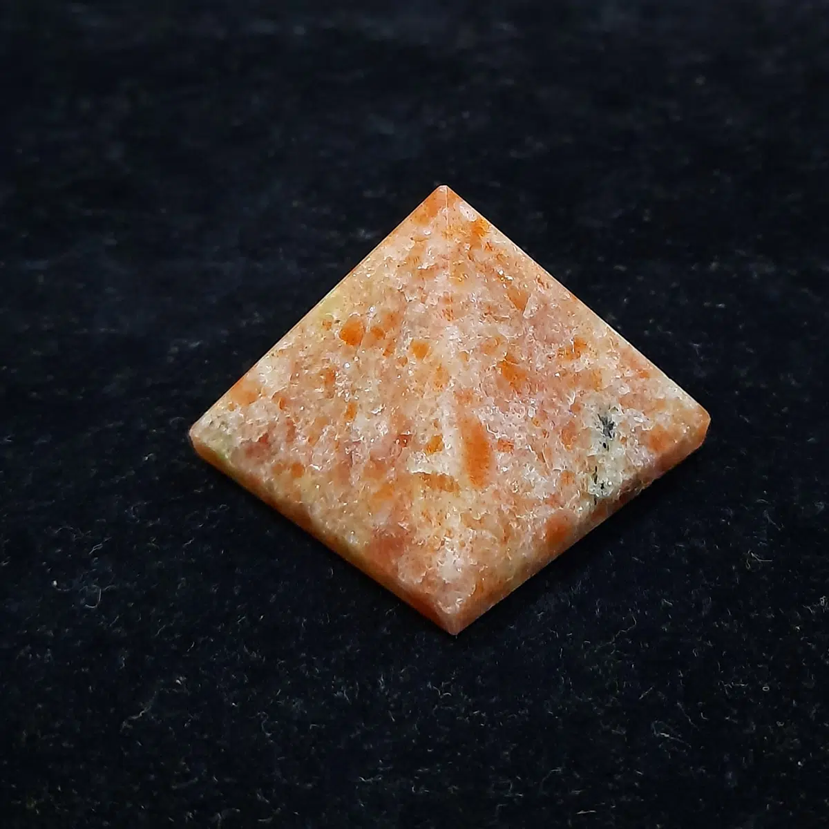 - Products Size : Length 4.5 cm x Width 5 cm x Height 4.5 cm | Weight : 100-150 gm|Color : Orange.You can place it in living room, children’s room, office, car, bring you peace.Sunstone Pyramid derives its power from the sacred geometry inherent in the three sided form. The most powerful area in a pyramid is in the center, near the apex, so it can be helpful to focus your intention on this spot.