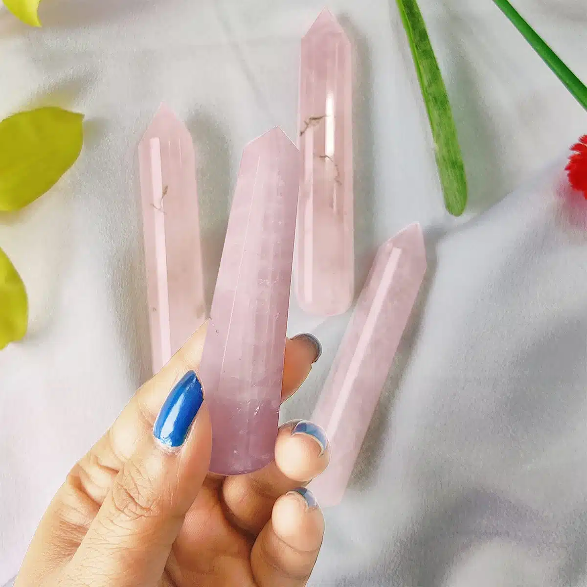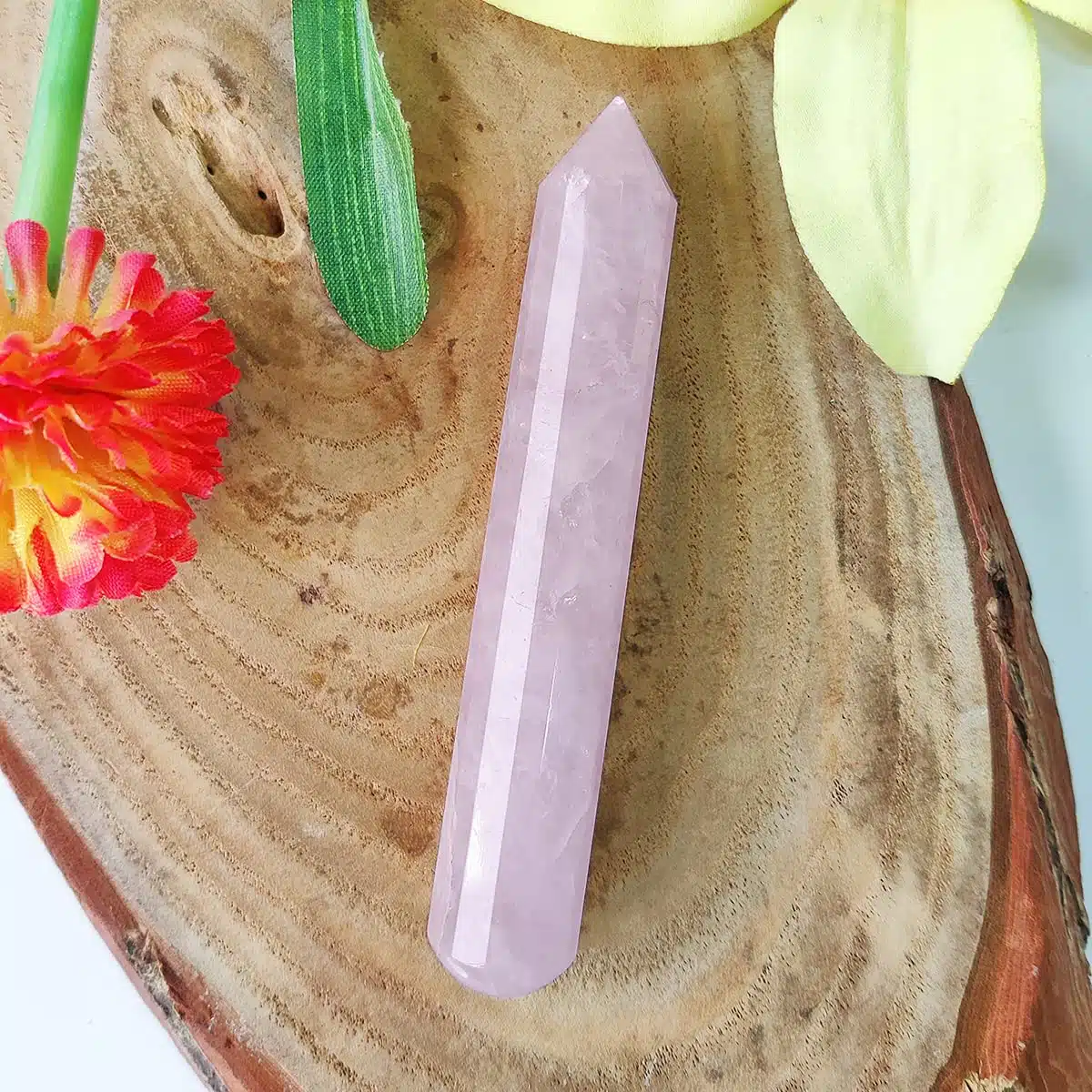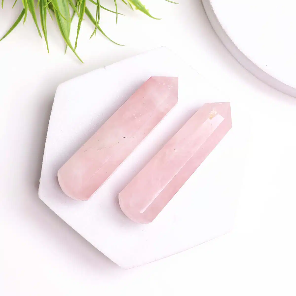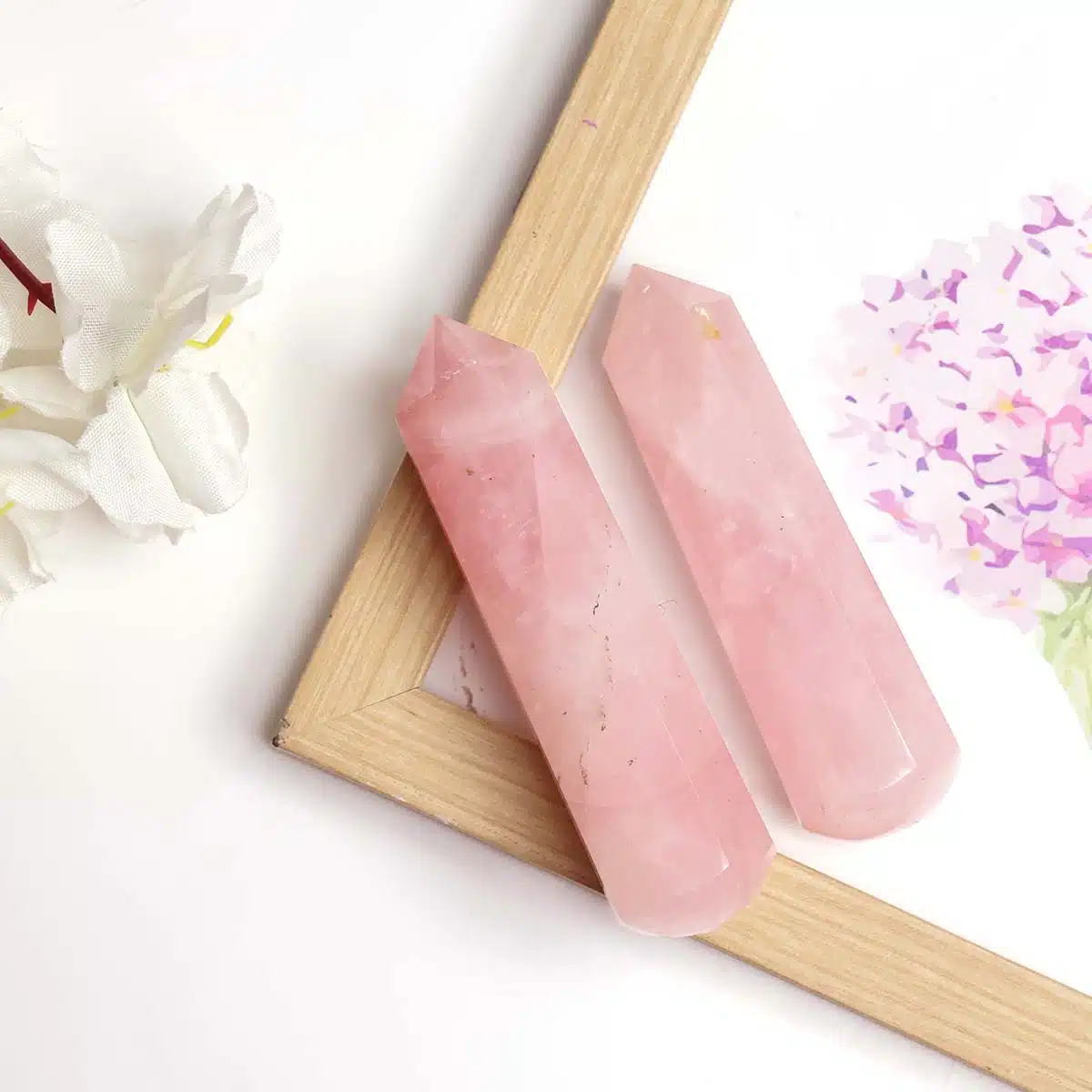 - These cut and polished,Rose Quartz Massage Wands have a pretty pink color.These wands have straight sides and a polished, rounded end. Wands are designed to be used with massage therapy, reflexology and acupressure. Massage wands are either rounded at both ends with one end wider than the other, or they have one rounded and one pointed end which would be great for massage or directing energy with the pointed end.