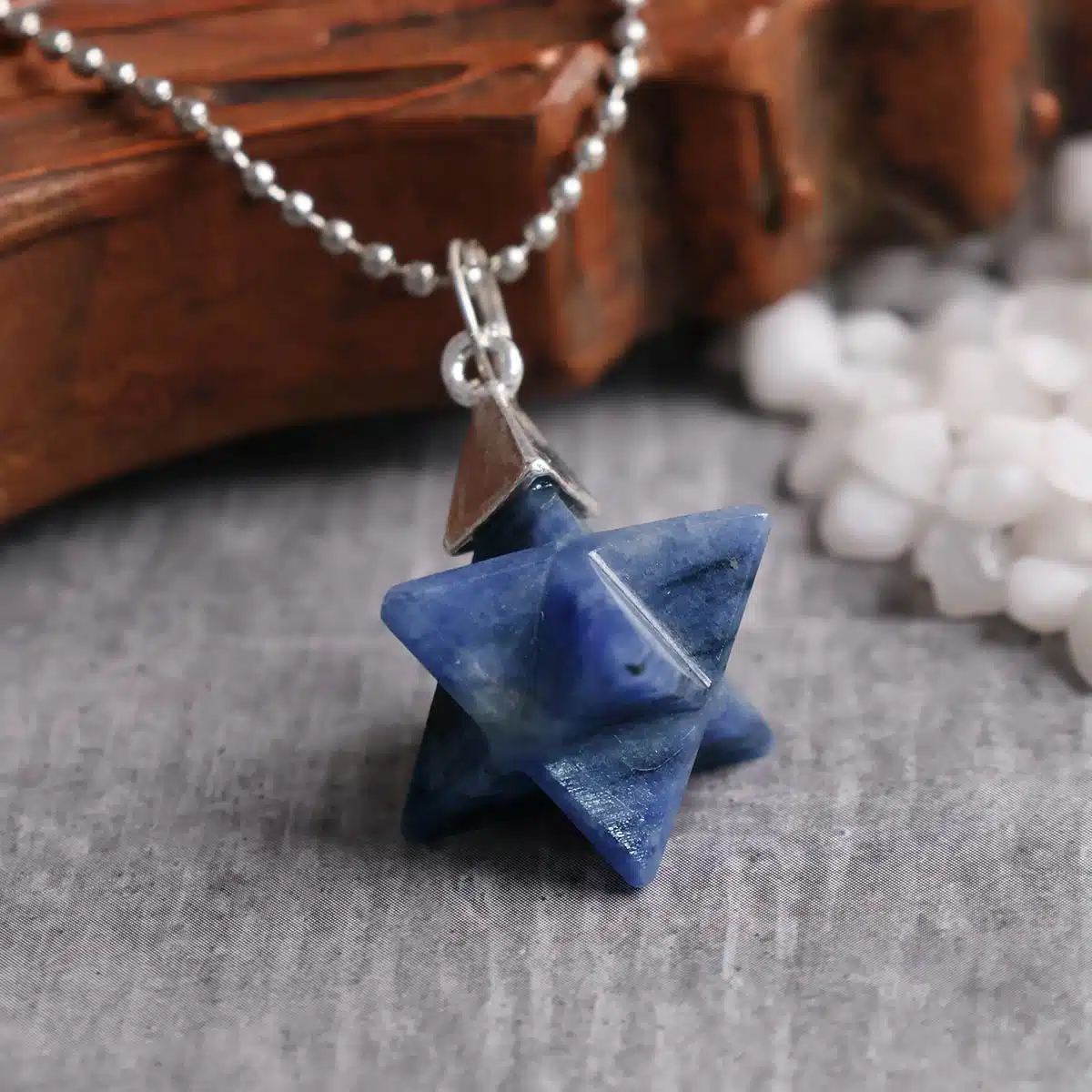 A Sodalite Merkaba shape pendant is a unique and interesting choice! Sodalite is a deep blue crystal with white streaks or patterns, and it is known for its association with communication, intuition, and mental clarity. The Merkaba shape, as mentioned before, is a sacred geometry symbol representing a three-dimensional star tetrahedron.