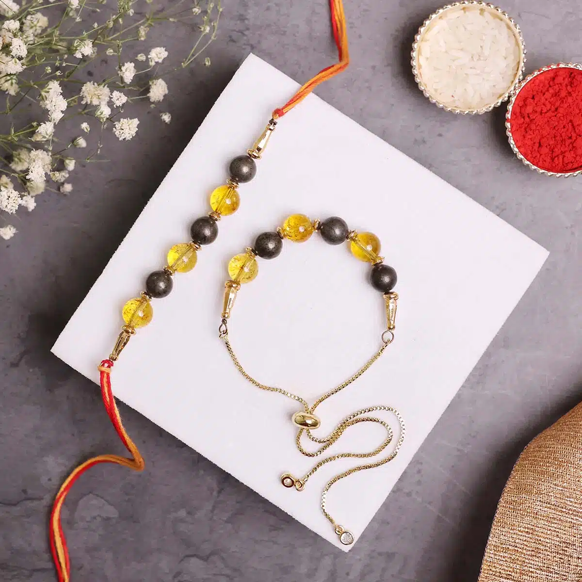 Natural Crystal | Citrine 8 mm 3 Beads | Pyrite 8 mm 3 Beads | Adjustable Handmade Success Rakhi.
