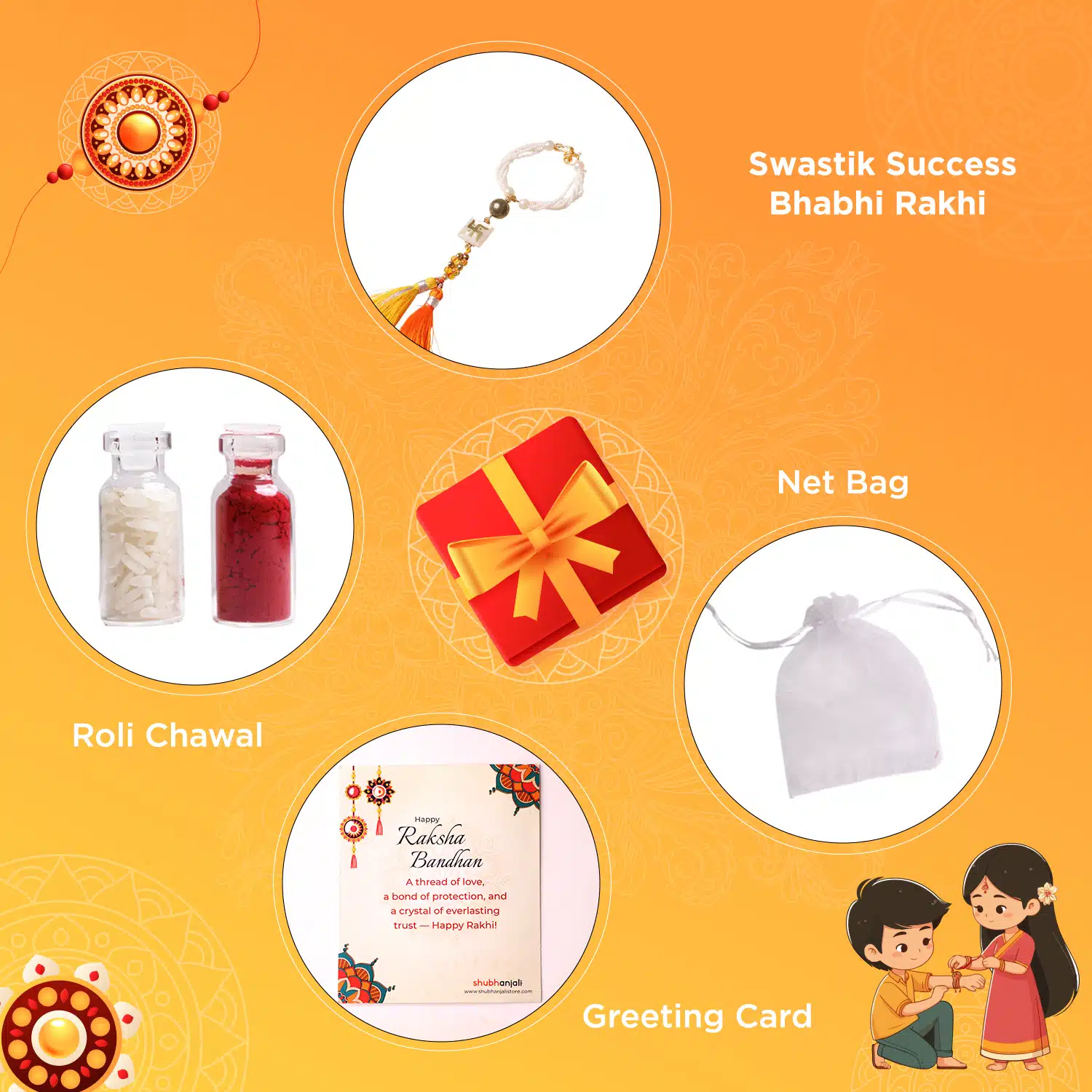 - With Box – Rakhi, Chawal-Kumkum, 2 chocolate coins, and a Rakhi card packed in a festive gift box.