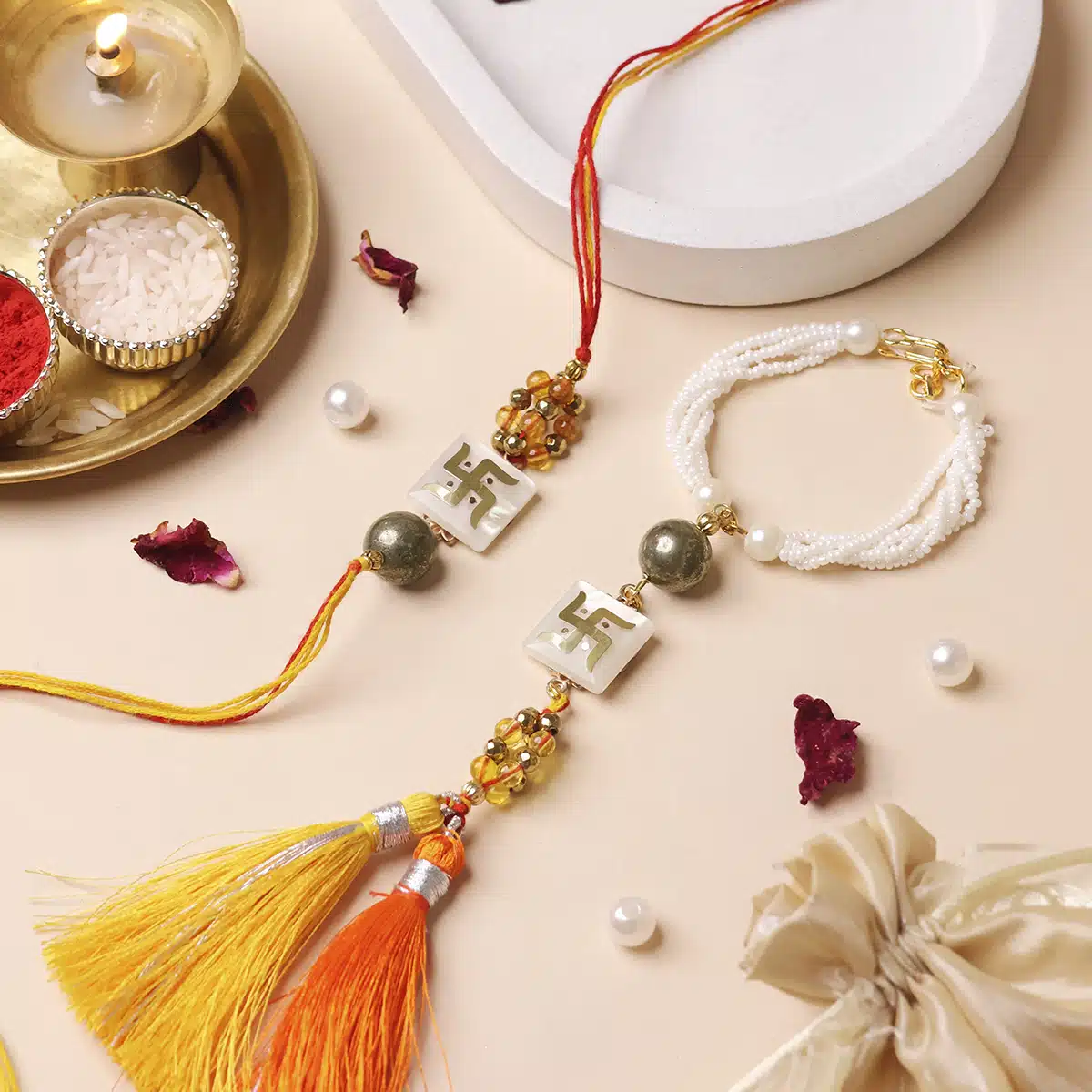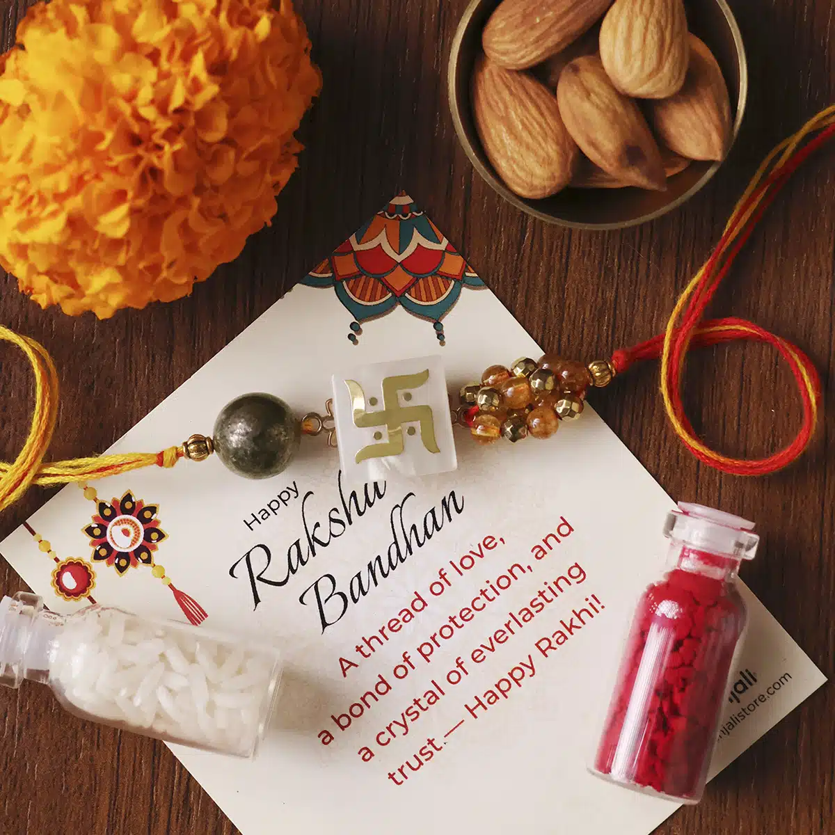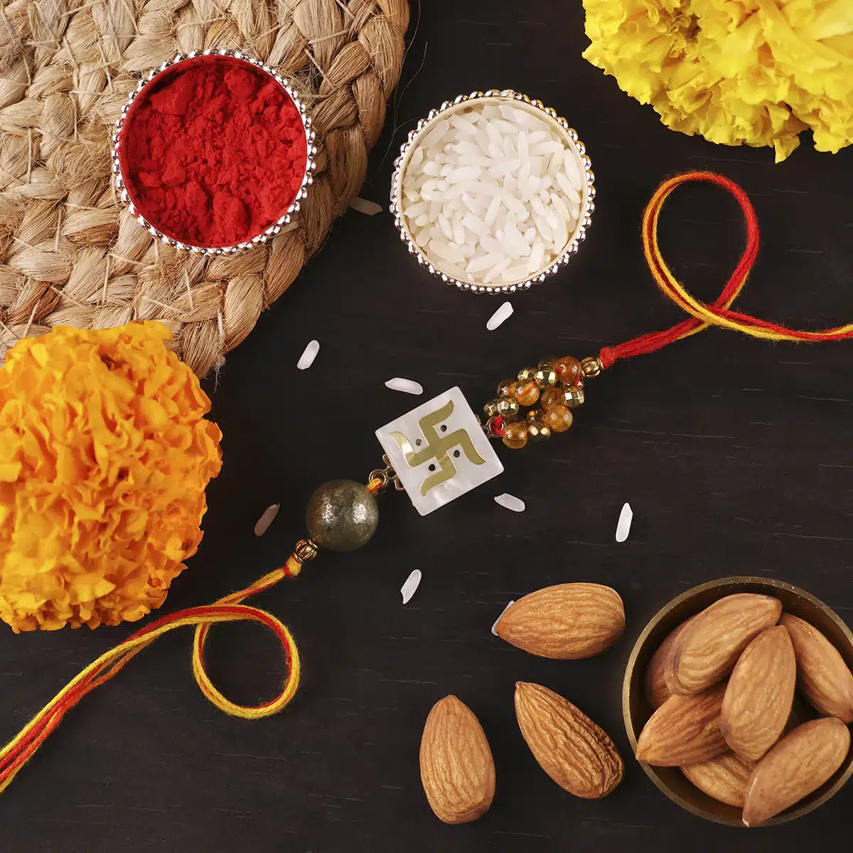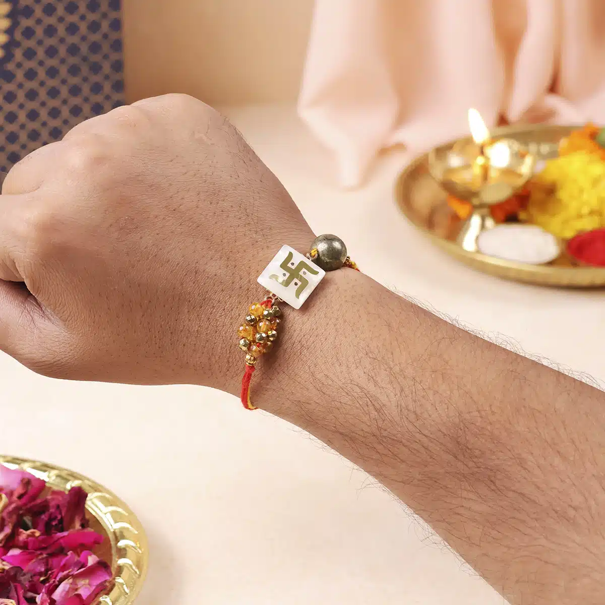 Swastik Charm (Big) – A revered Vedic symbol, Swastik represents divine blessings, prosperity, and good fortune. Placed at the center of the rakhi, it empowers the bond with strength and sacred protection for a prosperous life ahead.