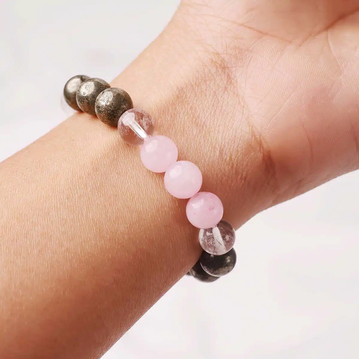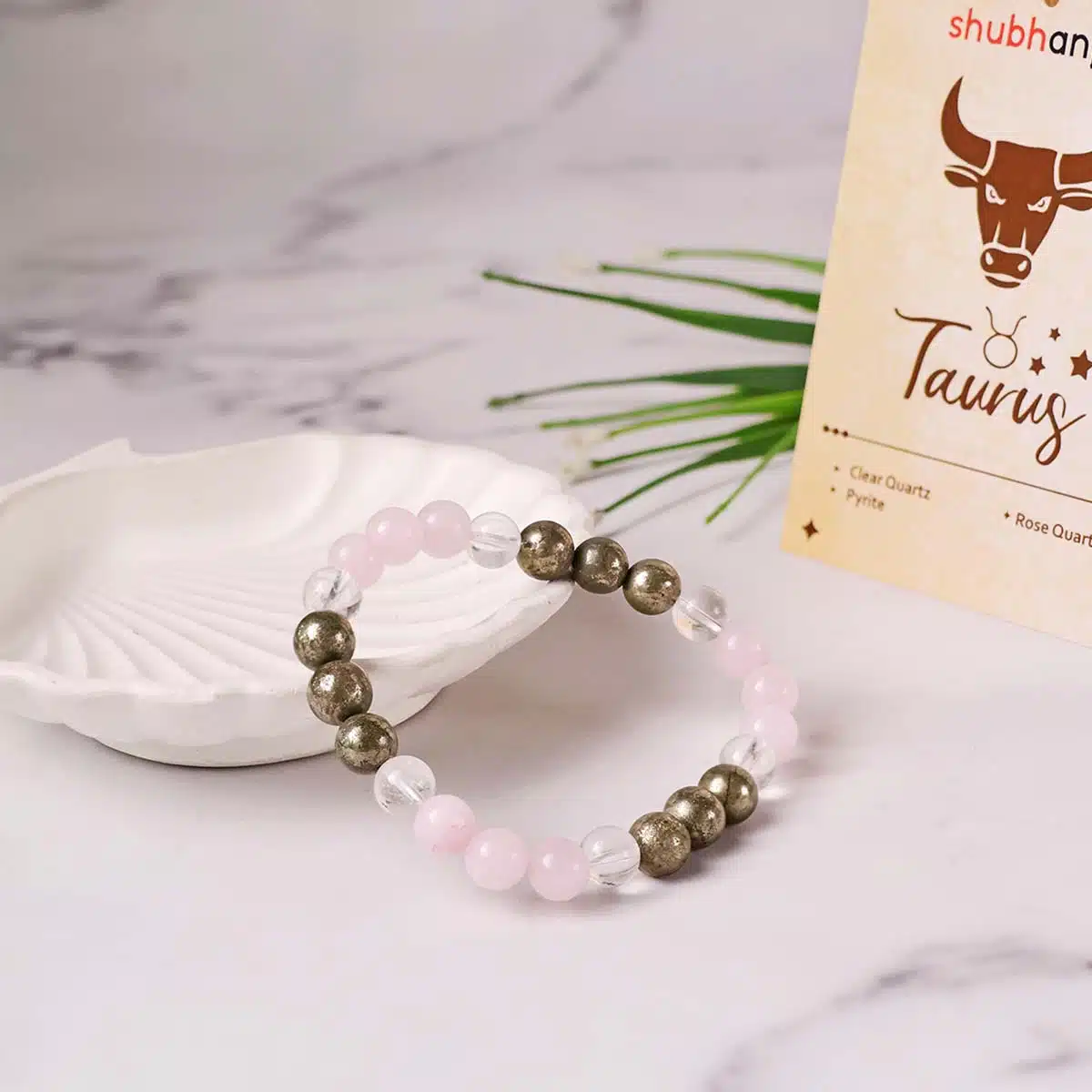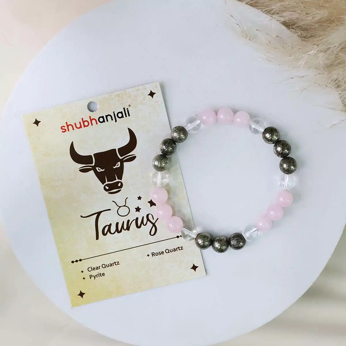 This Taurus (Vrishabha) Bracelet is made using the following quality power healing beads 8mm Rose Quartz,Clear Quartz,Pyrite.The bracelet made using strong jewellery elastic and will comfortably stretch to fIt’sizes.Taurus As stubborn as a Taurus! Your bracelet with zodiac sign.