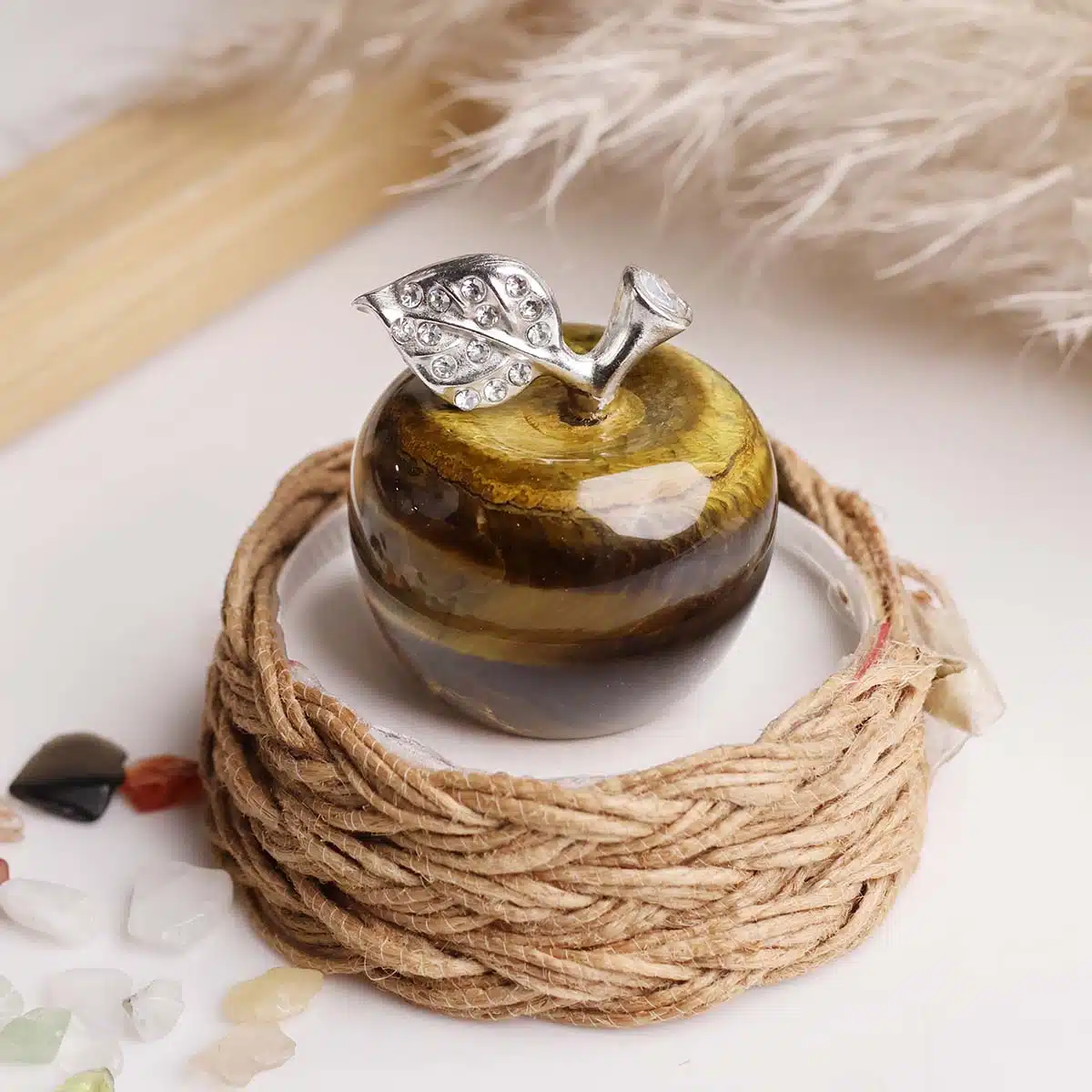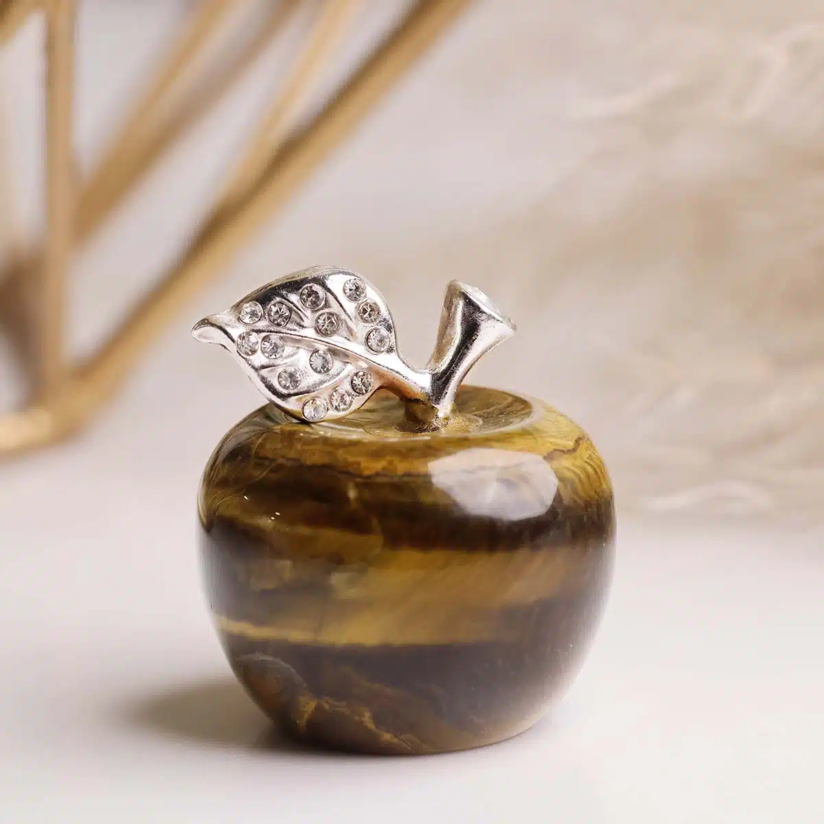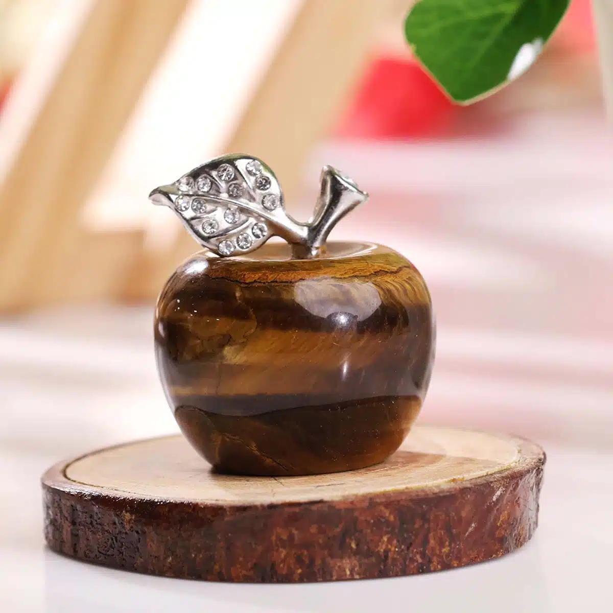 - As a decorative item, a Tiger Eye crystal apple can bring a sense of warmth, abundance, and protection into your space. Place it on your desk, nightstand, or in your living room to promote harmony and attract positive energy.