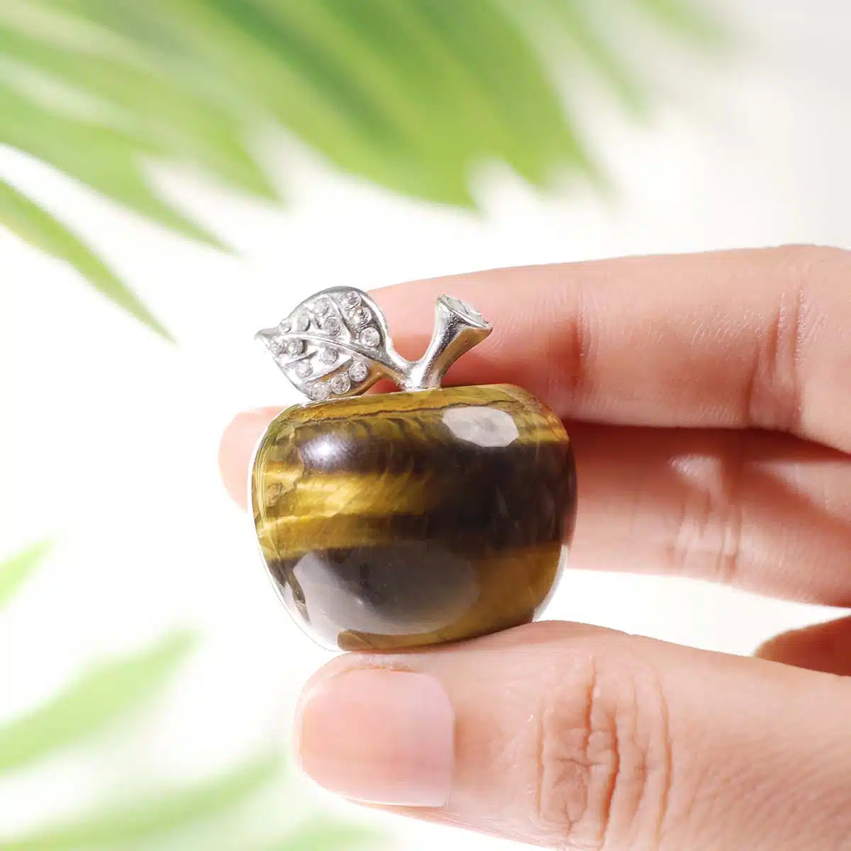 - The Tiger Eye stone is also known for its ability to boost personal strength, self-confidence, and decision-making skills. The apple shape here represents personal growth, health, and vitality, helping to encourage a balanced sense of self-worth and empowerment.