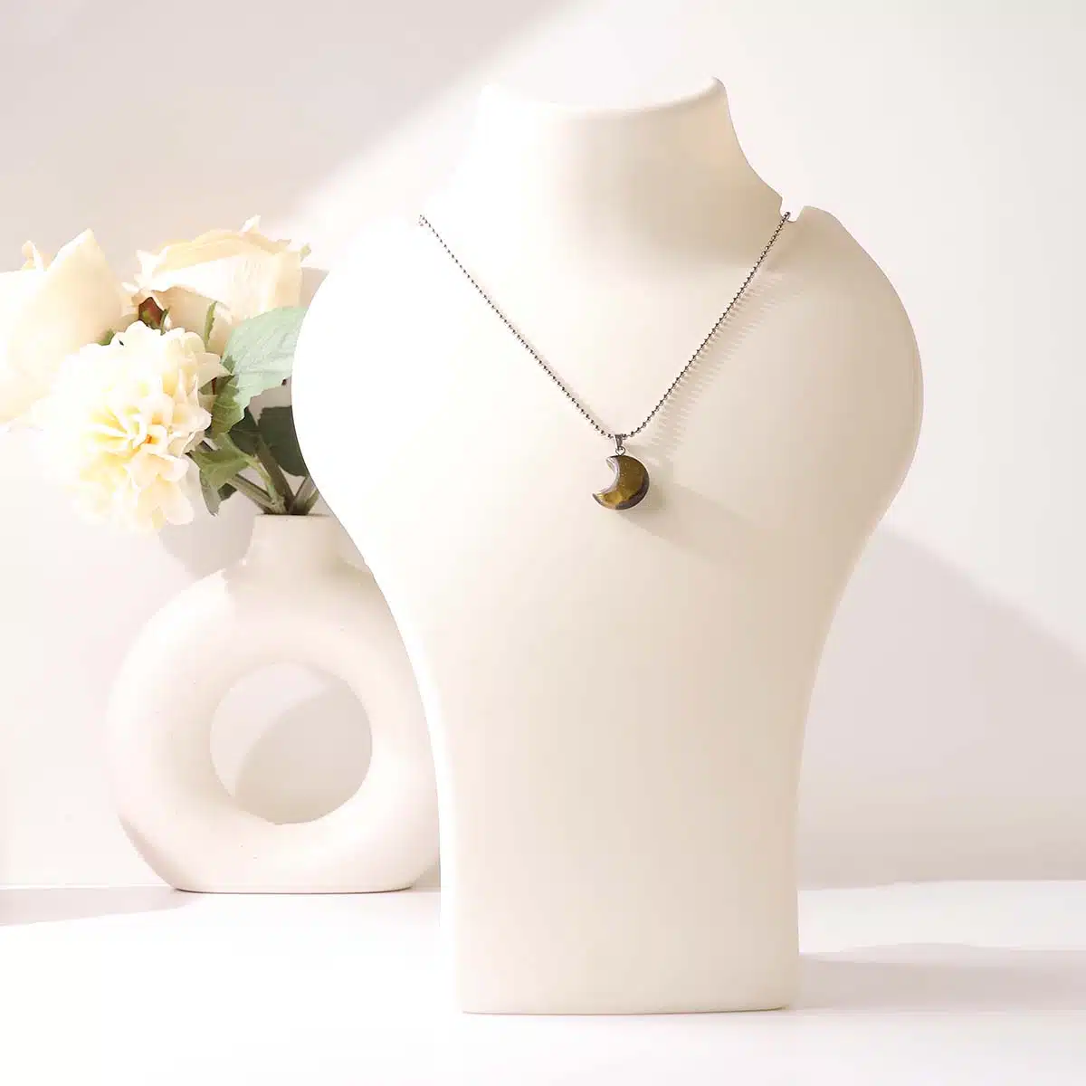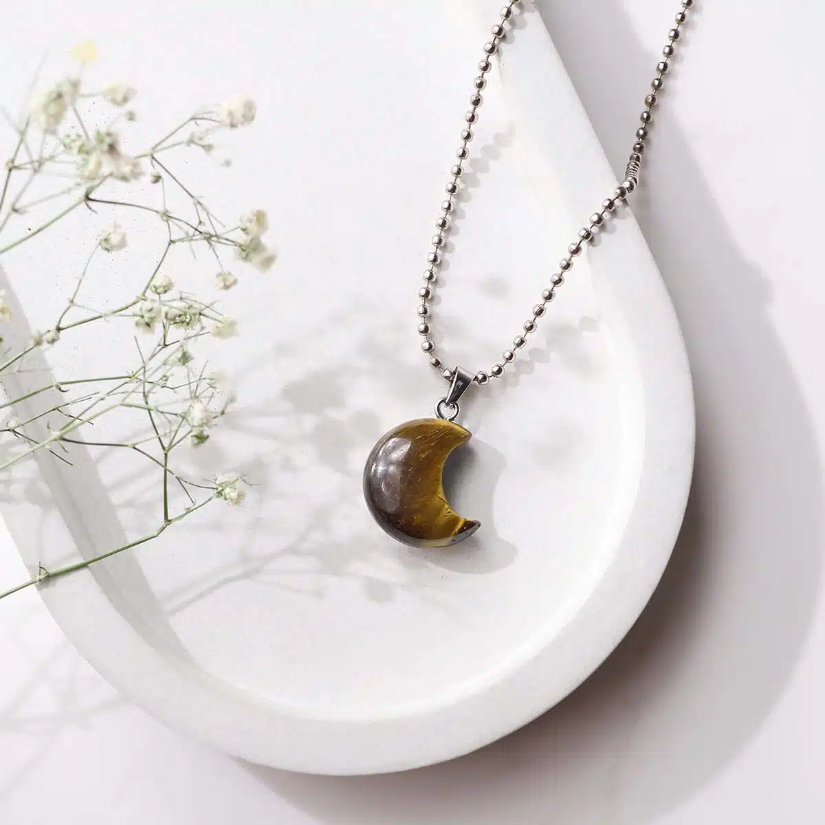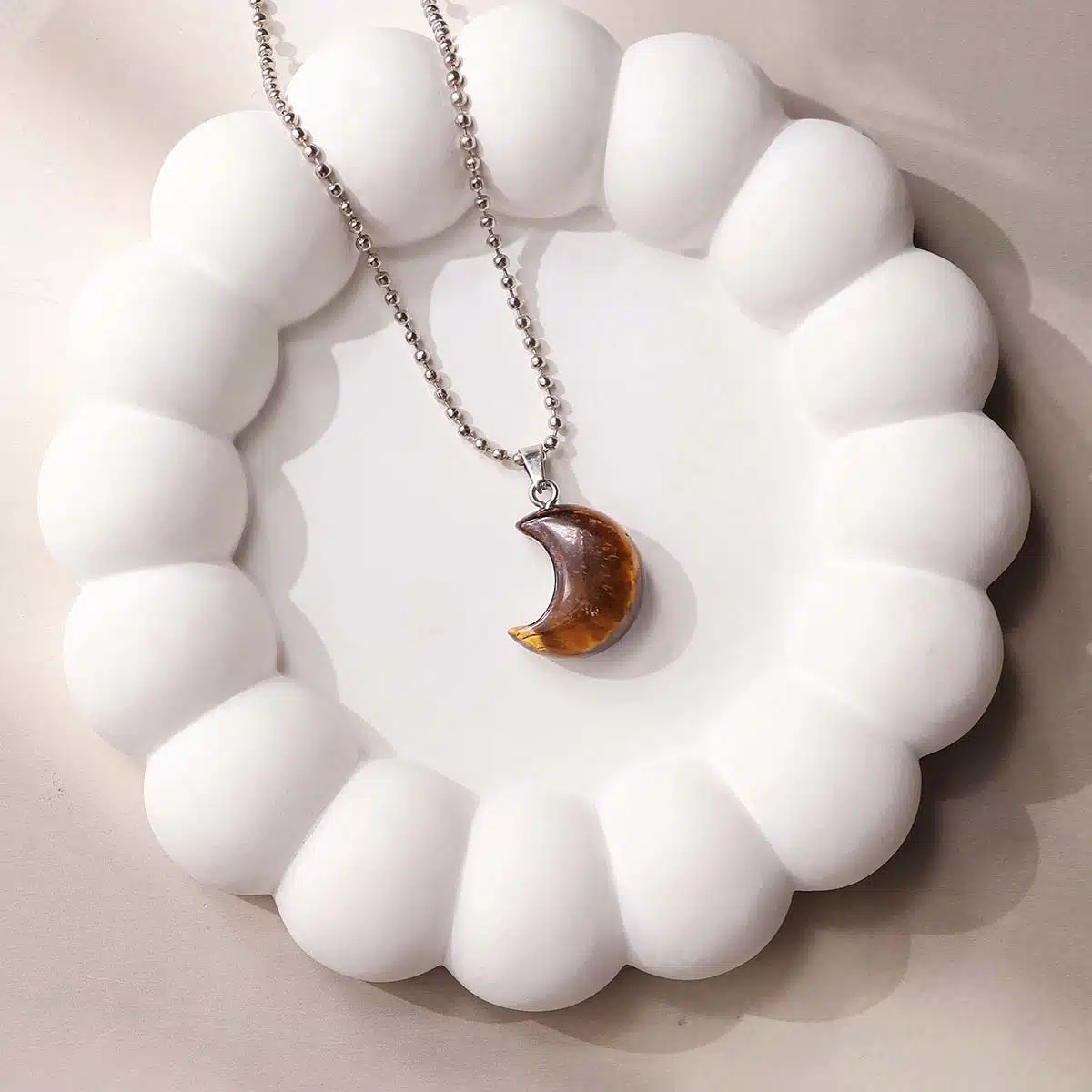 • The half-moon shape symbolizes renewal, intuition, and personal growth, amplifying Tiger Eye’s stabilizing energy.