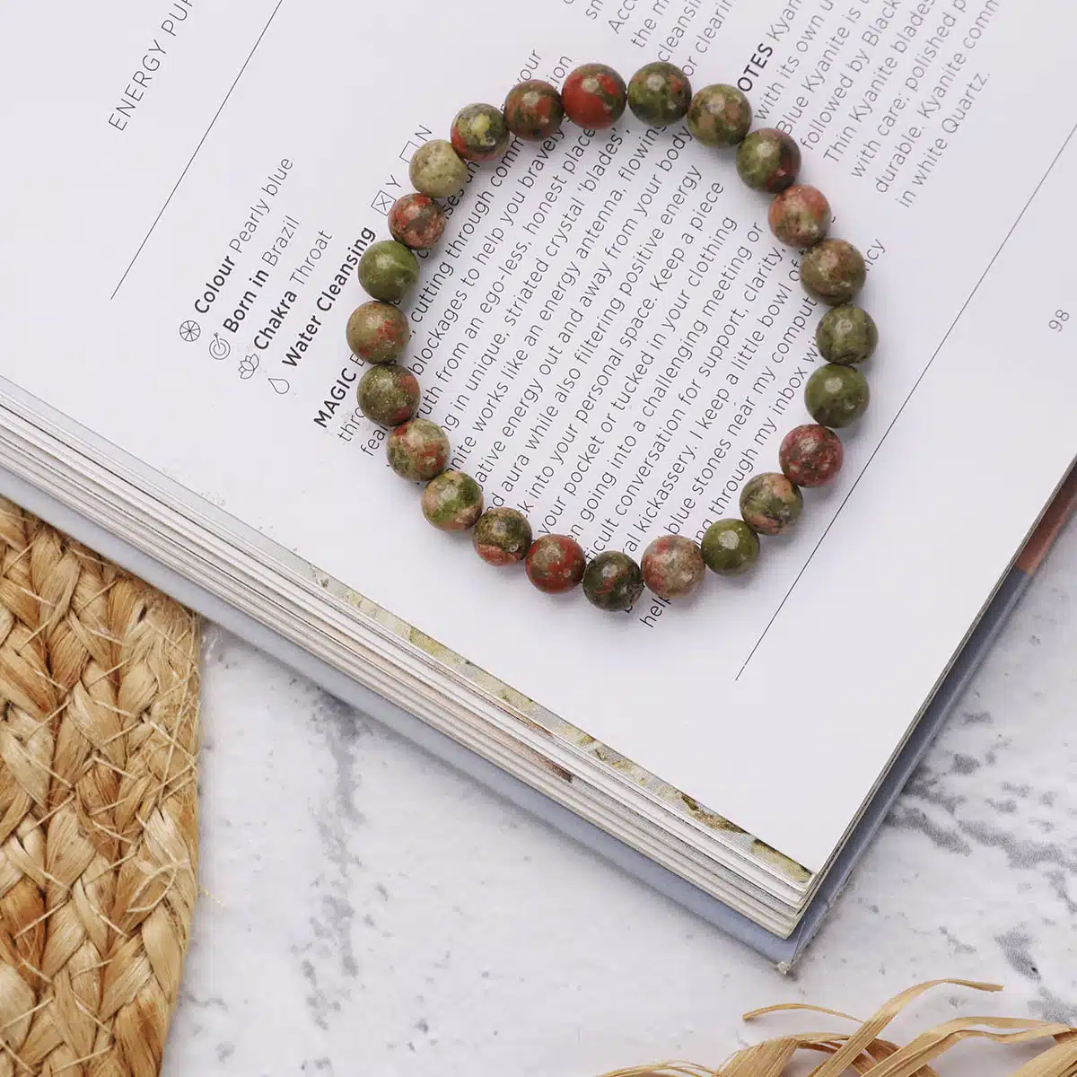 - Unakite is believed to bring together the abundant, nurturing energy of green with the soft, caring passion of pink in one of Nature’s most healing crystals of the heart and mind.Unakite Bracelet Meaning Unakite supports the physical body by purging toxicity from old emotional wounds and attachments, anger and resentment, and bad habits like overeating. It gradually supports a healthy alignment of physical, mental, and spiritual bodies, helping the body become a support for higher experiences.