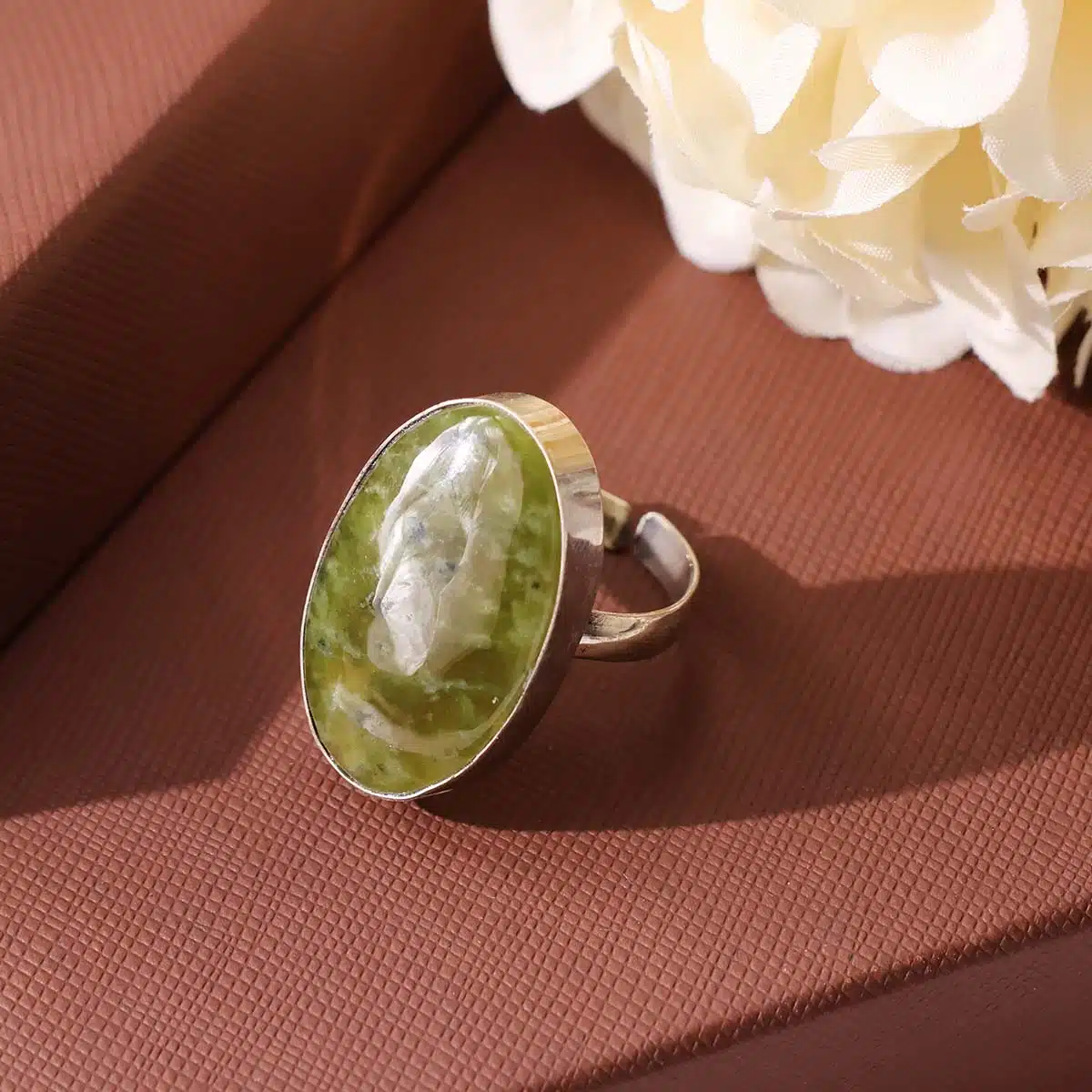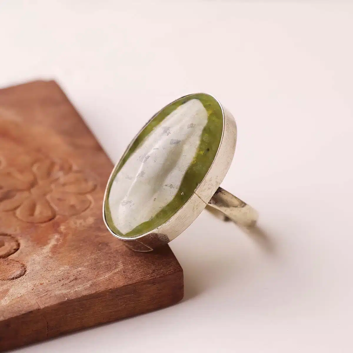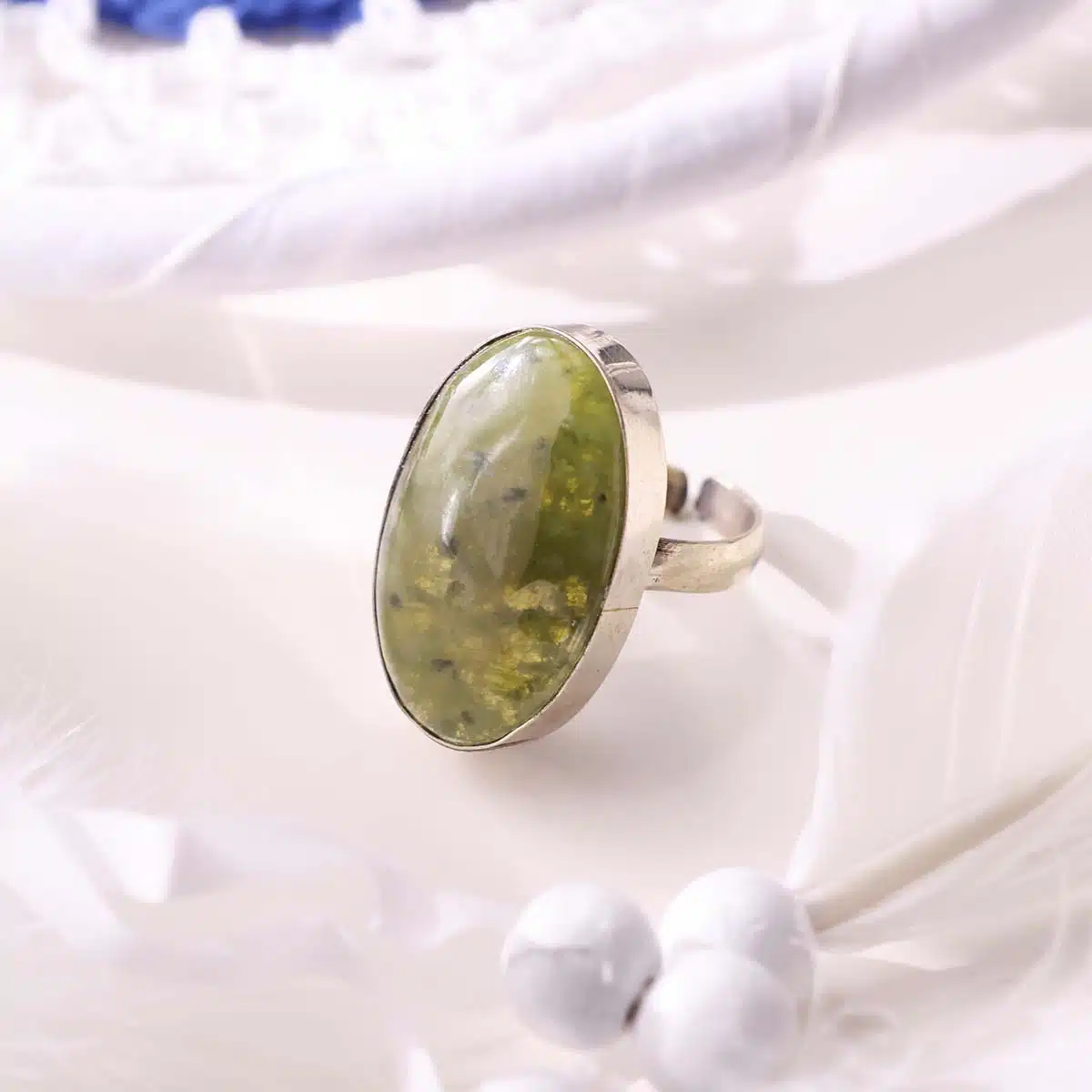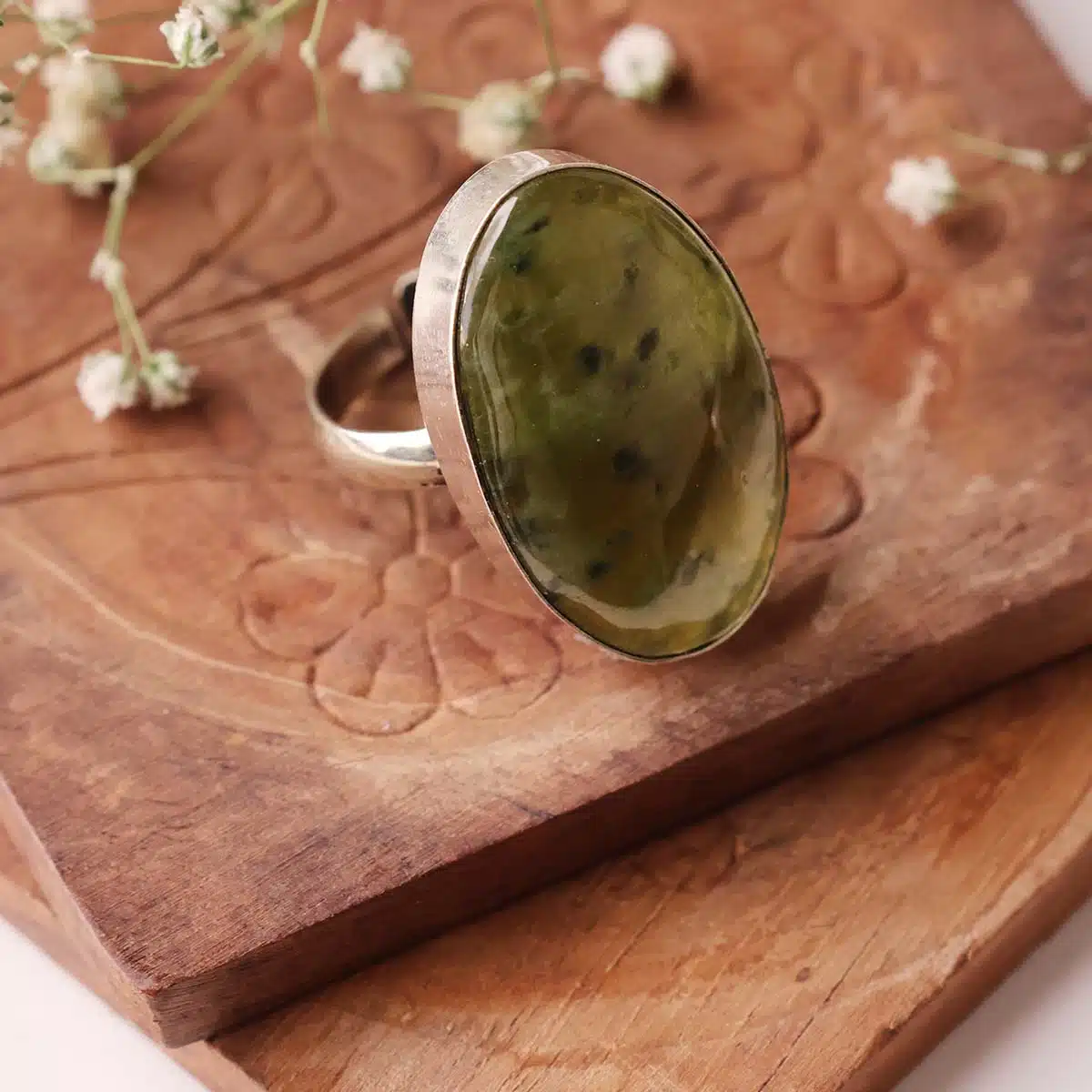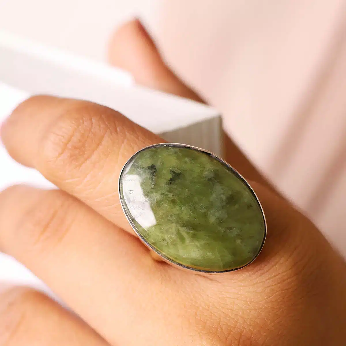 The Vesuvianite Cabochon Ring features a smooth, polished gemstone known for its grounding and empowering energy. Its rich earthy-green tones inspire courage, clarity, and positive transformation.