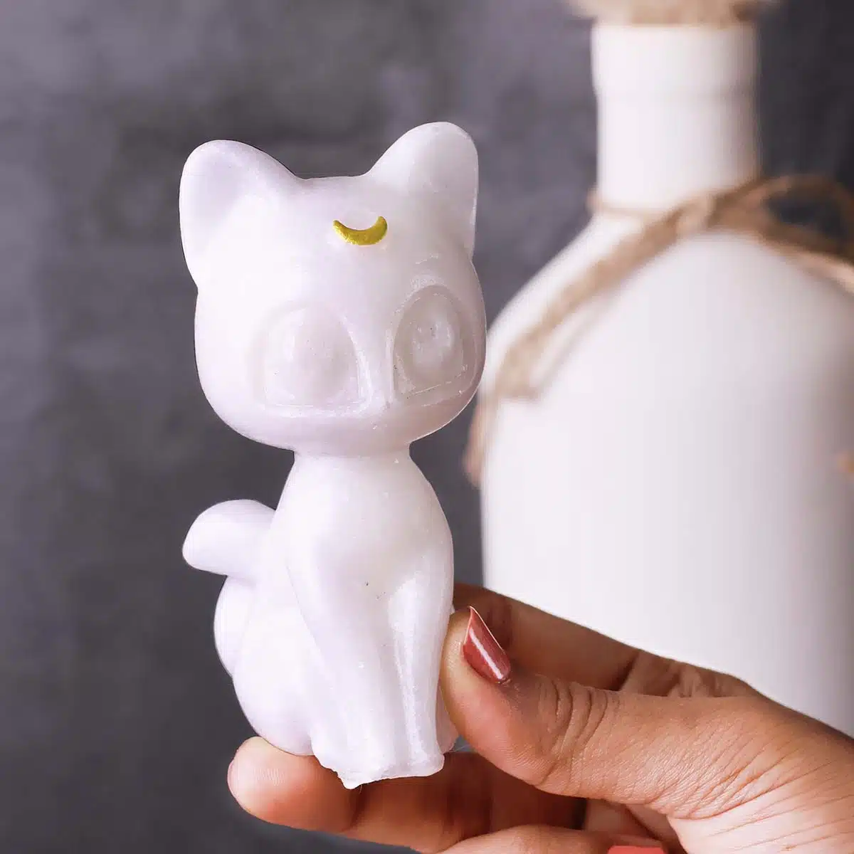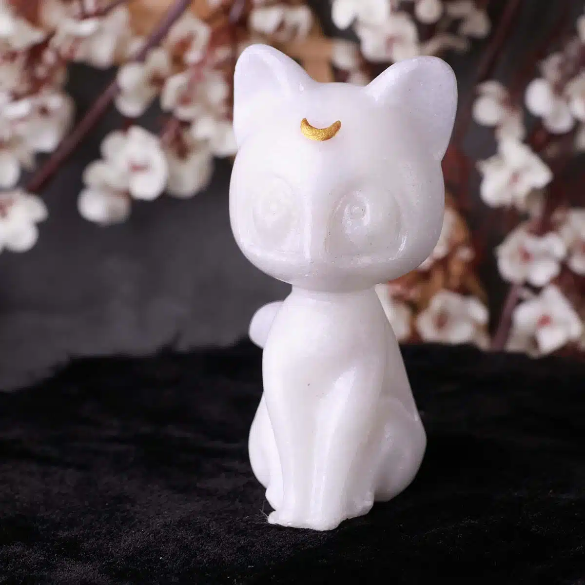 - This White Jade Cat With Moon enhances spiritual energy and purification.