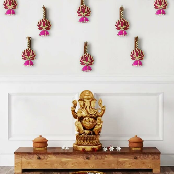 The Wooden Lotus Jhumki Hanging is a versatile and aesthetically pleasing decorative item suitable for a wide range of occasions and celebrations. Whether it’s a special function, pooja ceremony, marriage, engagement, or festive gatherings like Diwali, Dusshera, or Ganesh Chaturthi, these exquisite wooden lotus jhumki hangings add an elegant touch to your decor. Crafted with intricate detailing, these lotus-shaped ornaments symbolize purity, enlightenment, and spirituality, making them an ideal choice for auspicious events like weddings and poojas. Their warm wooden texture and charming design also complement the festive atmosphere during Diwali and other celebrations, adding a touch of traditional and cultural flair to your decorations. These hangings are not just decorative but carry cultural significance, making them a delightful addition to any occasion.