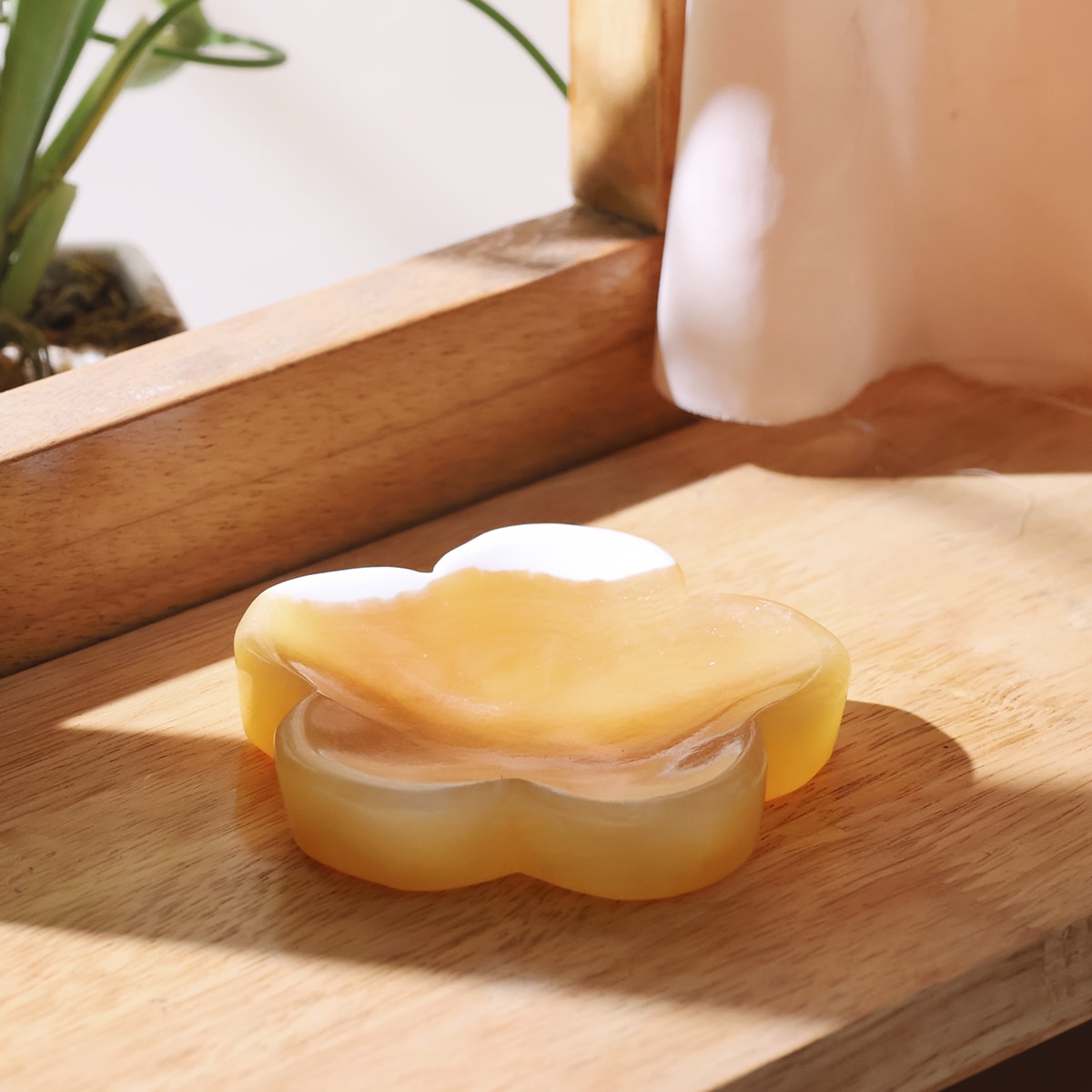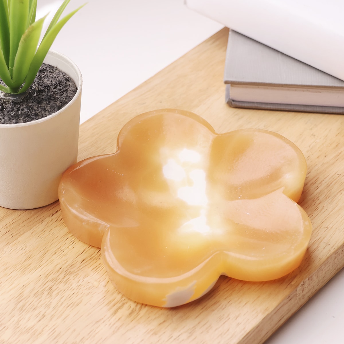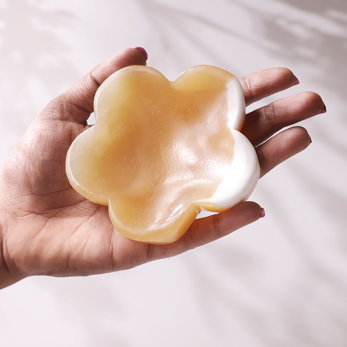 A little sunshine blossoms into a bowl. Yellow Calcite shaped like a flower brings cheerful warmth to any space. This charming handcrafted piece holds tiny treasures with grace, freshens the energy around it, and reminds you to keep blooming.