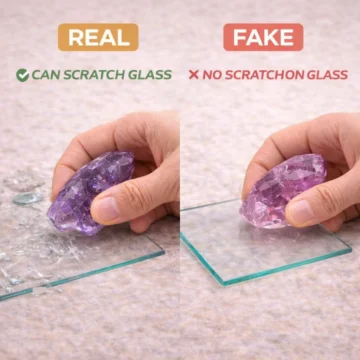 Quartz-based crystals like amethyst or citrine can scratch glass. Fake glass crystals cannot. Still, this test risks damaging genuine stones and should be used sparingly.