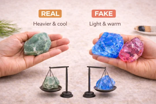 Authentic crystals usually feel heavier than they look. Natural stones have density. Fake stones made of glass or resin often feel light.
